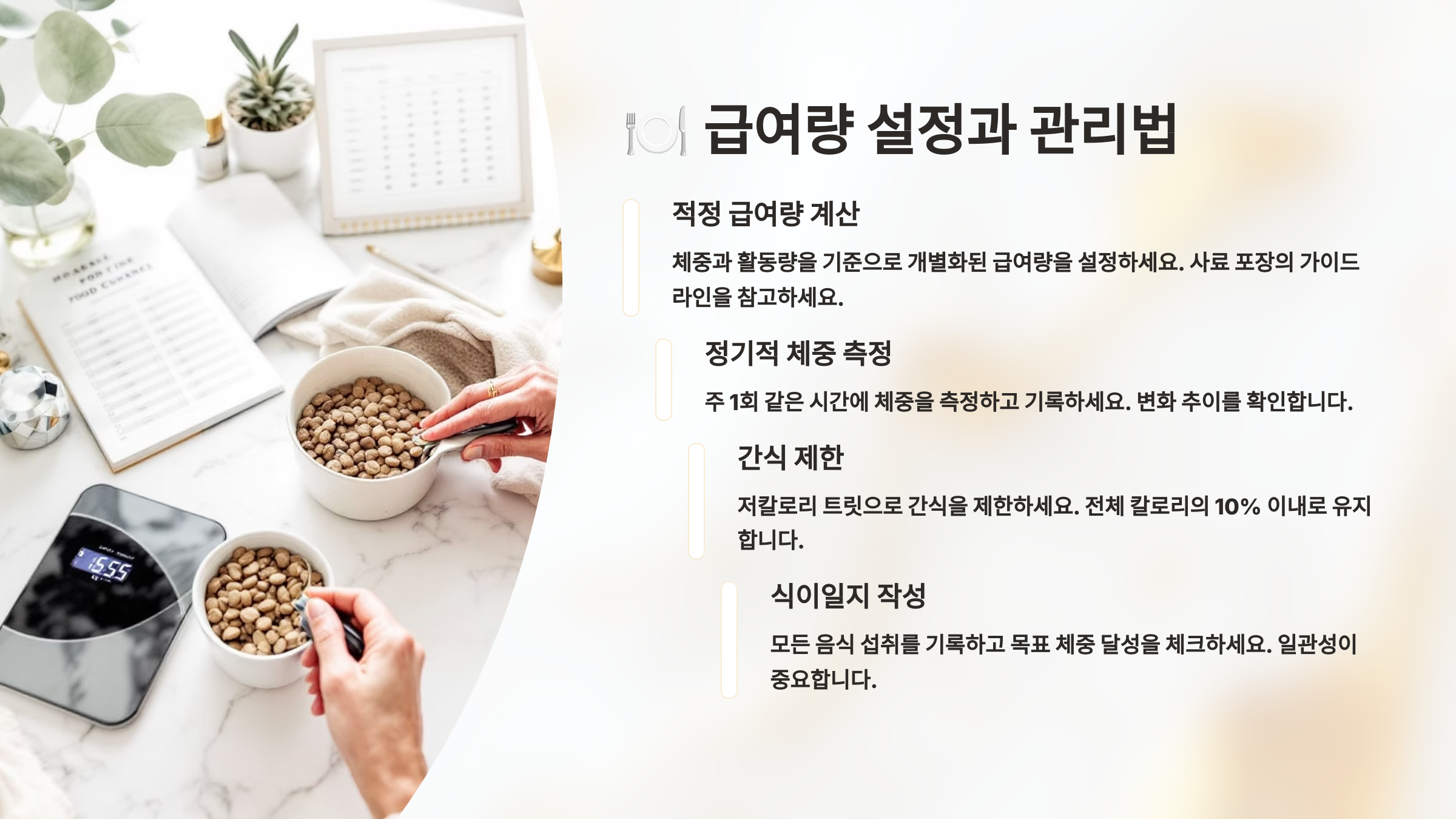 다이어트 사료의 급여량은 일반 사료보다 더 정확하게 계산해야 해요. 목표 체중을 기준으로 급여량을 결정하는 것이 핵심이에요. 예를 들어 현재 15kg인 강아지의 적정 체중이 12kg라면, 12kg 기준으로 급여량을 계산해야 해요. 보통 현재 체중 기준 급여량의 75-80% 정도로 시작해서, 체중 감량 속도를 보면서 조절하는 것이 좋아요. 너무 급격하게 줄이면 스트레스를 받고, 영양 부족이 올 수 있거든요.