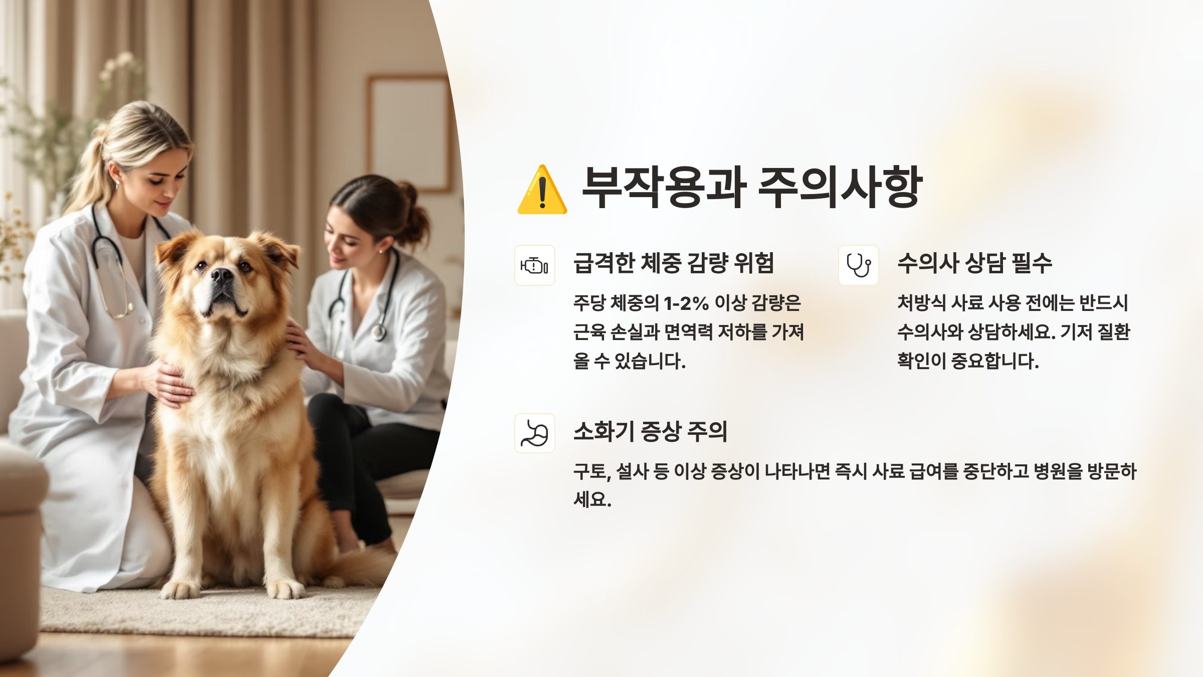 다이어트 사료를 급여할 때 가장 주의해야 할 부작용은 영양 결핍이에요. 칼로리를 줄이는 과정에서 필수 영양소까지 부족해질 수 있거든요. 특히 단백질이 부족하면 근육량이 줄어들고, 비타민 B군이 부족하면 털이 거칠어지고 활력이 떨어져요. 이런 증상이 나타나면 즉시 수의사와 상담해야 해요. 또한 지나치게 빠른 체중 감량은 간에 부담을 줄 수 있어서, 주당 체중의 1-2%를 넘지 않도록 조절해야 해요.