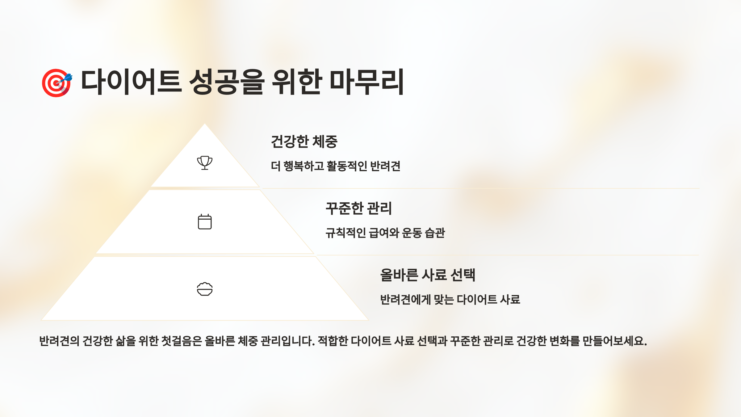 성공적인 다이어트를 위해서는 사료 교체와 함께 적절한 운동, 간식 관리, 정기적인 체중 측정이 병행되어야 해요. 또한 다이어트 과정에서 나타날 수 있는 부작용들을 미리 알고 대비하는 것도 중요하고요. 특히 급격한 변화보다는 점진적이고 지속 가능한 방법을 선택해야 강아지의 스트레스를 최소화하면서도 건강하게 체중을 감량할 수 있어요.