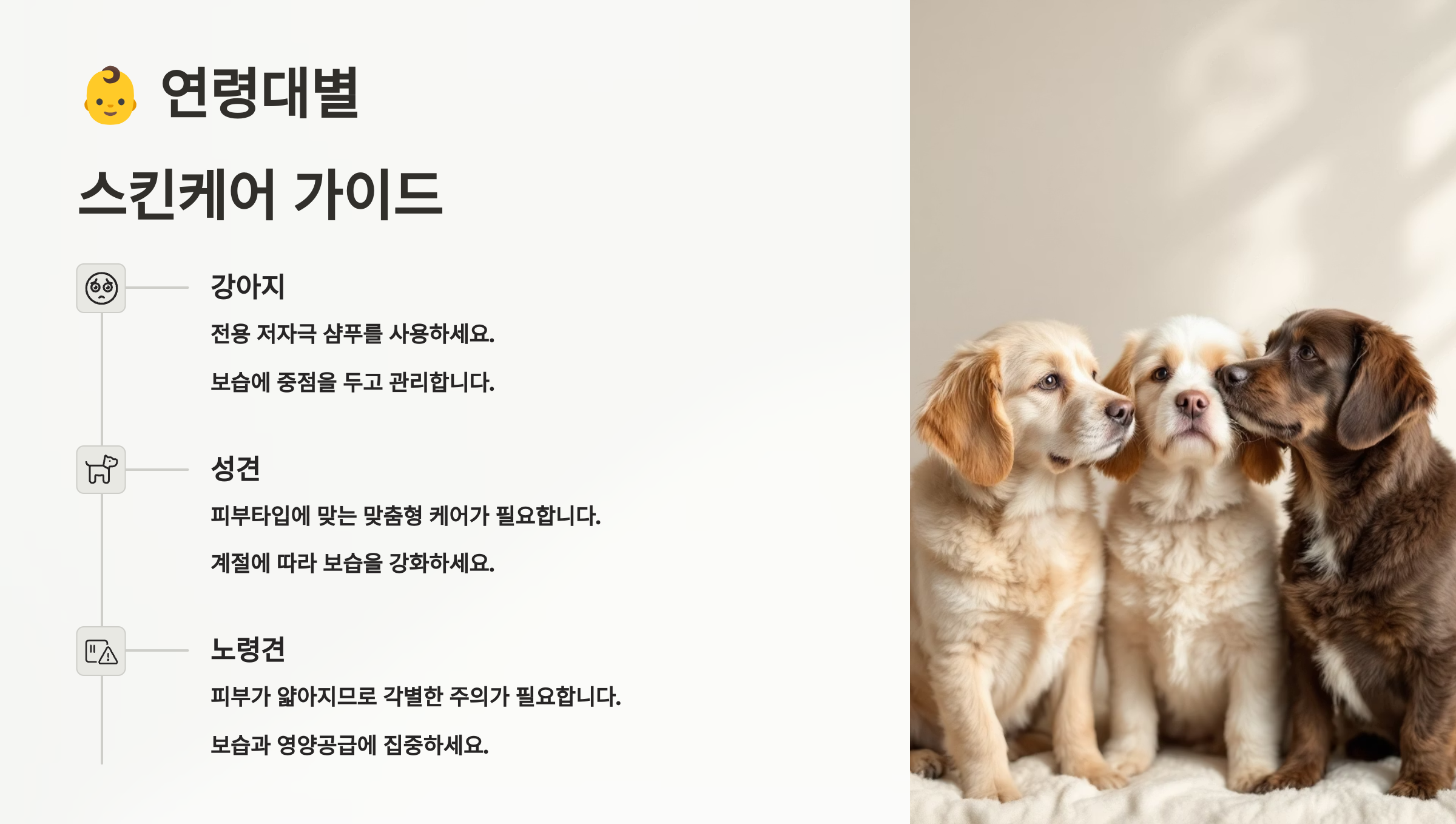 | 퍼피(~1세) | 연약한 피부 | 극순한 제품 사용 |
