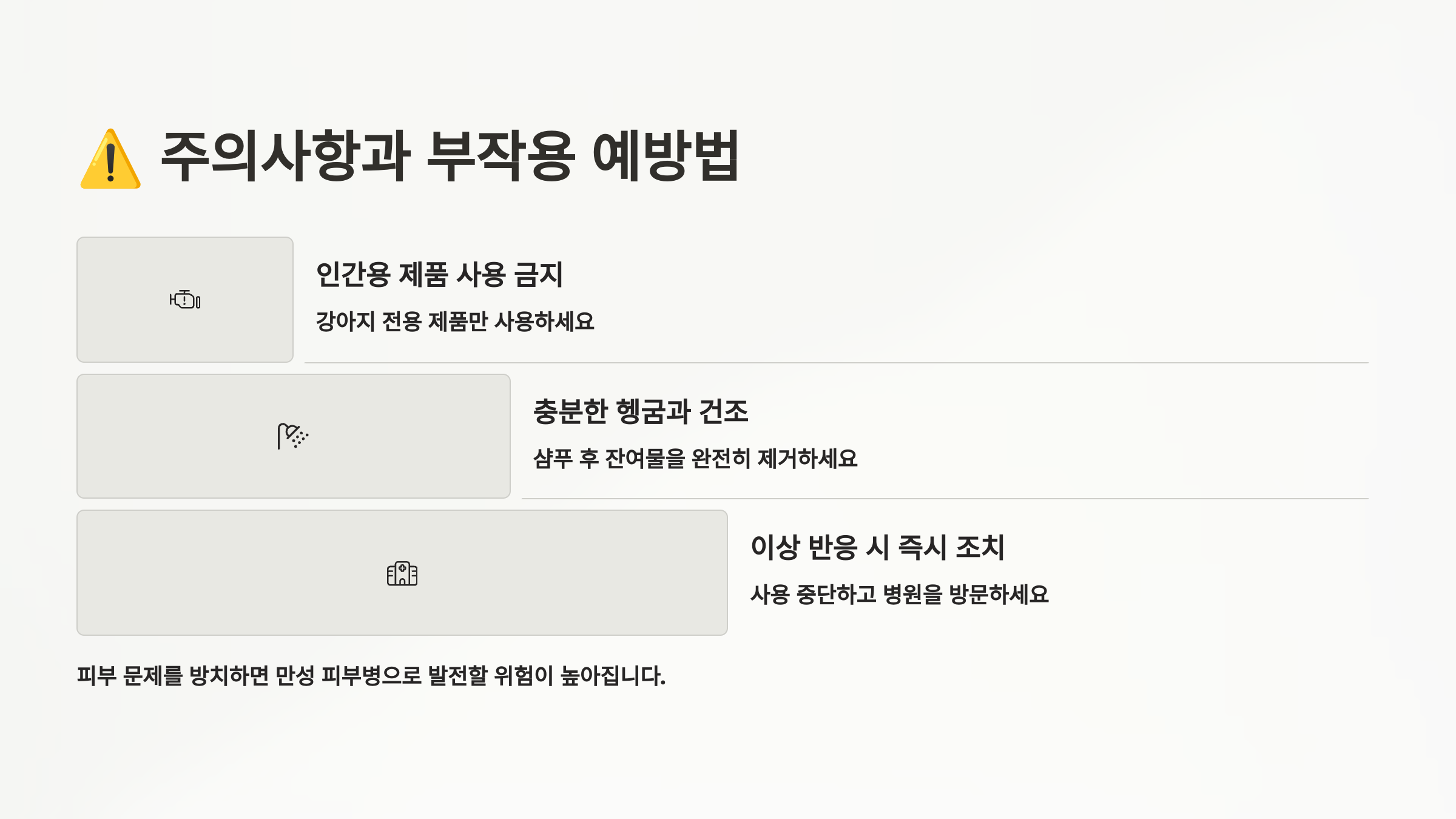 강아지 스킨케어에서 가장 주의해야 할 점은 사람용 제품을 절대 사용하지 않는 것이에요. 사람과 강아지의 피부 pH가 다르기 때문에 사람용 제품은 강아지 피부에 자극을 줄 수 있어요. 특히 비누나 샴푸에 들어있는 계면활성제는 강아지 피부의 자연 보호막을 손상시킬 수 있고, 향료나 방부제 등도 알레르기 반응을 일으킬 수 있어요. 응급상황이라도 베이비 제품이나 무향 제품을 임시로 사용하는 정도로 제한하고, 가능한 한 빨리 전용 제품으로 바꿔주세요.