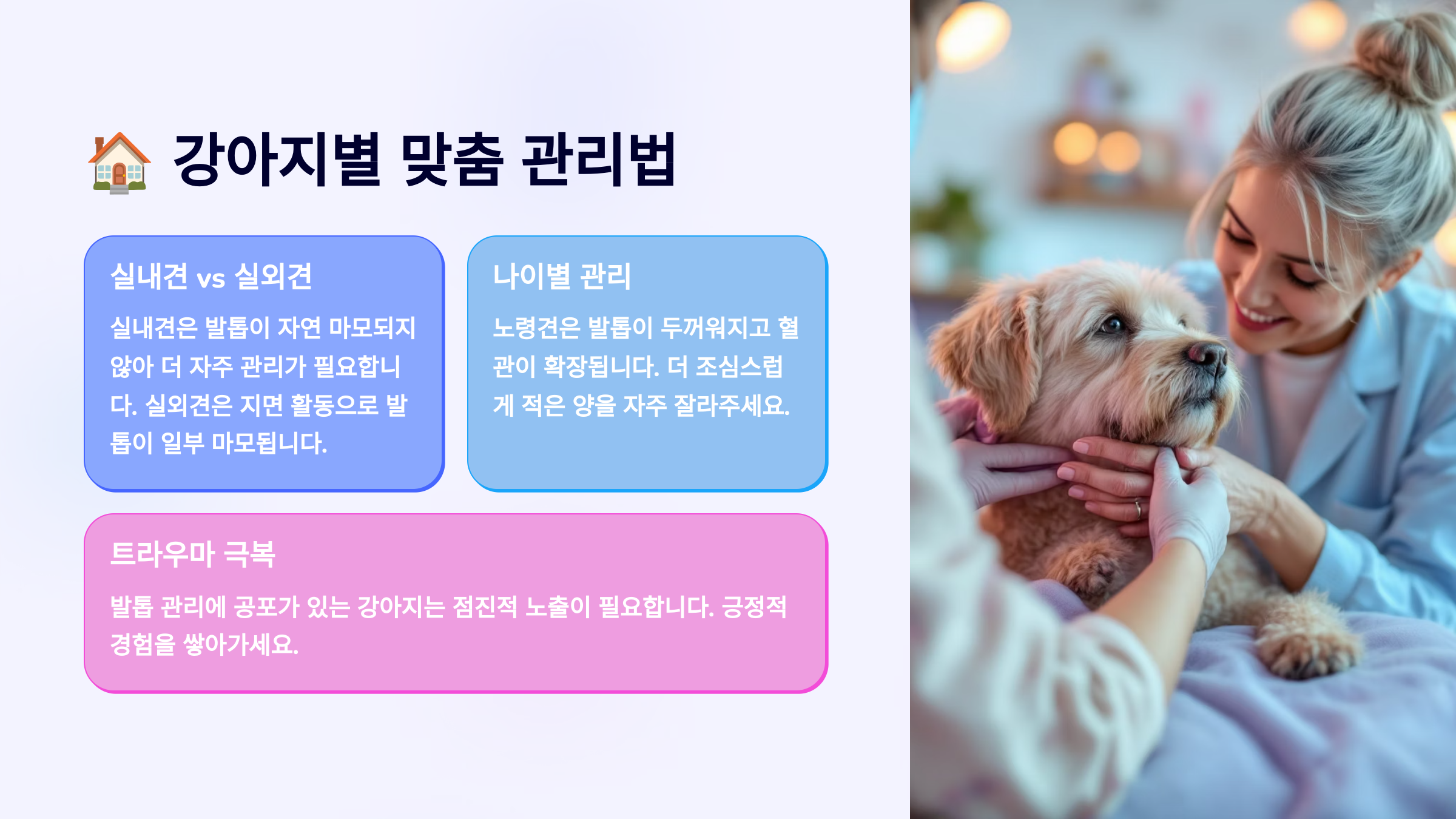 강아지의 크기, 나이, 성격에 따라 발톱 관리 방법을 맞춤화하는 것이 중요해요. 소형견의 경우 발톱이 가늘고 민감해서 더욱 조심스럽게 접근해야 해요. 치와와, 포메라니안, 말티즈 같은 초소형견은 발 자체가 작아서 정밀한 작업이 필요하고, 퀵의 위치도 발톱 끝과 가까워서 특별한 주의가 필요해요. 이런 견종들은 스트레스를 많이 받는 편이라서 평소 발 만지기 훈련을 충분히 하고, 발톱을 자를 때도 한 번에 1-2개씩만 하는 것이 좋아요. 반면 대형견은 발톱이 두껍고 단단해서 더 강한 도구가 필요하고, 힘이 세서 안전하게 고정하는 것이 중요해요. 골든 리트리버, 래브라도 같은 대형견은 비교적 순한 성격이지만, 힘이 세므로 도우미의 도움을 받거나 전문적인 고정 기구를 사용하는 것이 안전해요.
