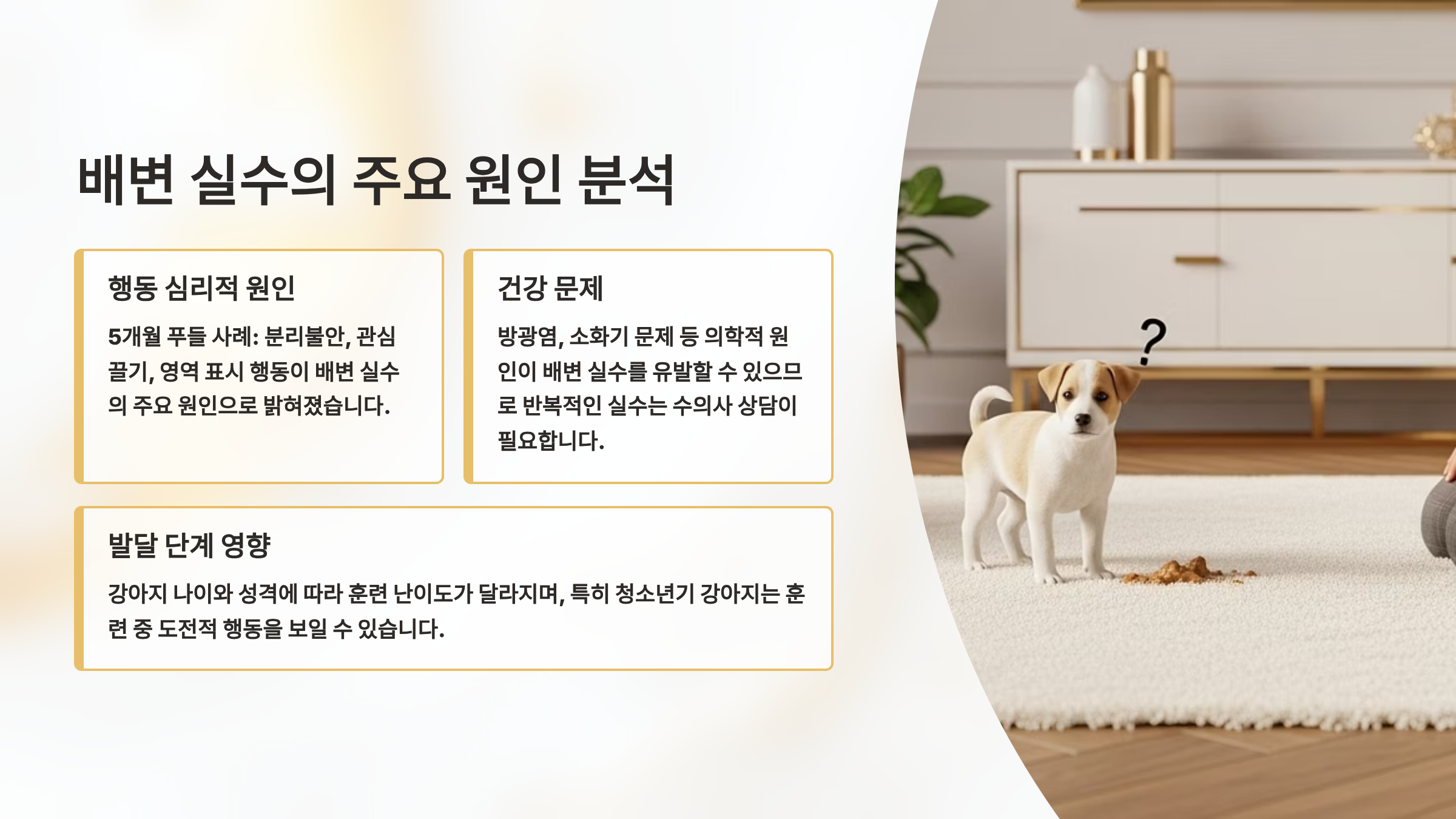 강아지가 집안 곳곳에 배변 실수를 하면 정말 스트레스받으시죠? 하지만 강아지를 혼내기 전에 왜 그런 행동을 하는지 이해하는 것이 중요해요. 배변 실수는 단순한 버릇 문제가 아니라 다양한 원인이 숨어있을 수 있답니다. 오늘은 체계적인 방법으로 배변 훈련을 성공시킬 수 있는 모든 노하우를 알려드릴게요! 🐶