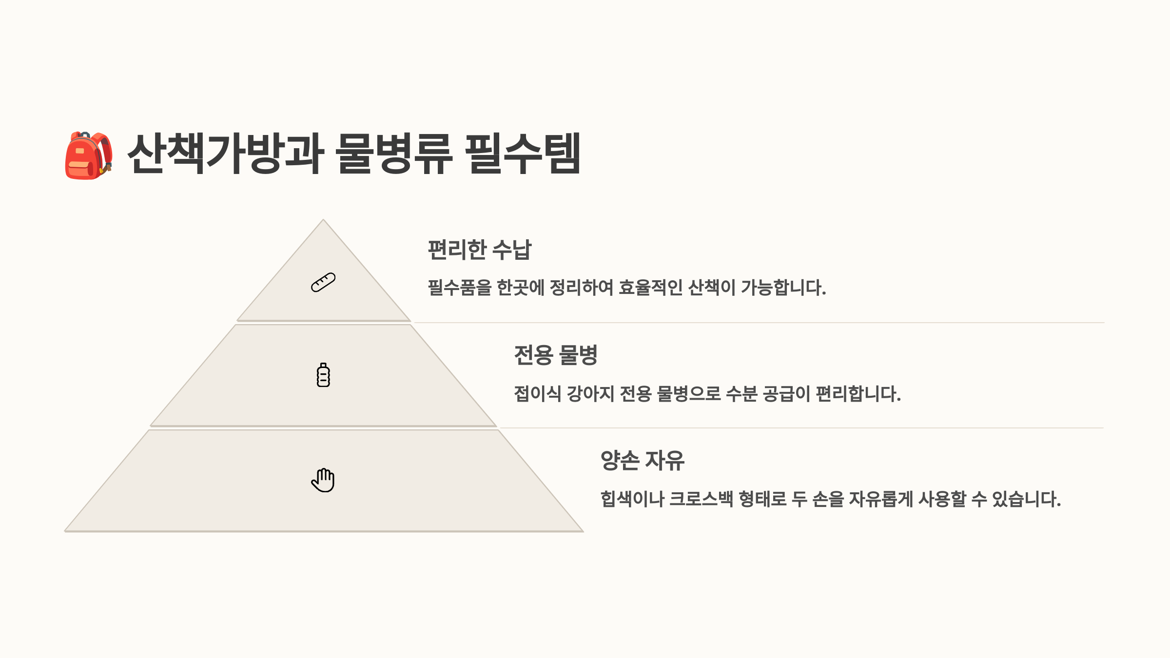 | 백팩 | 대용량, 균형 좋음 | 장거리 산책 |