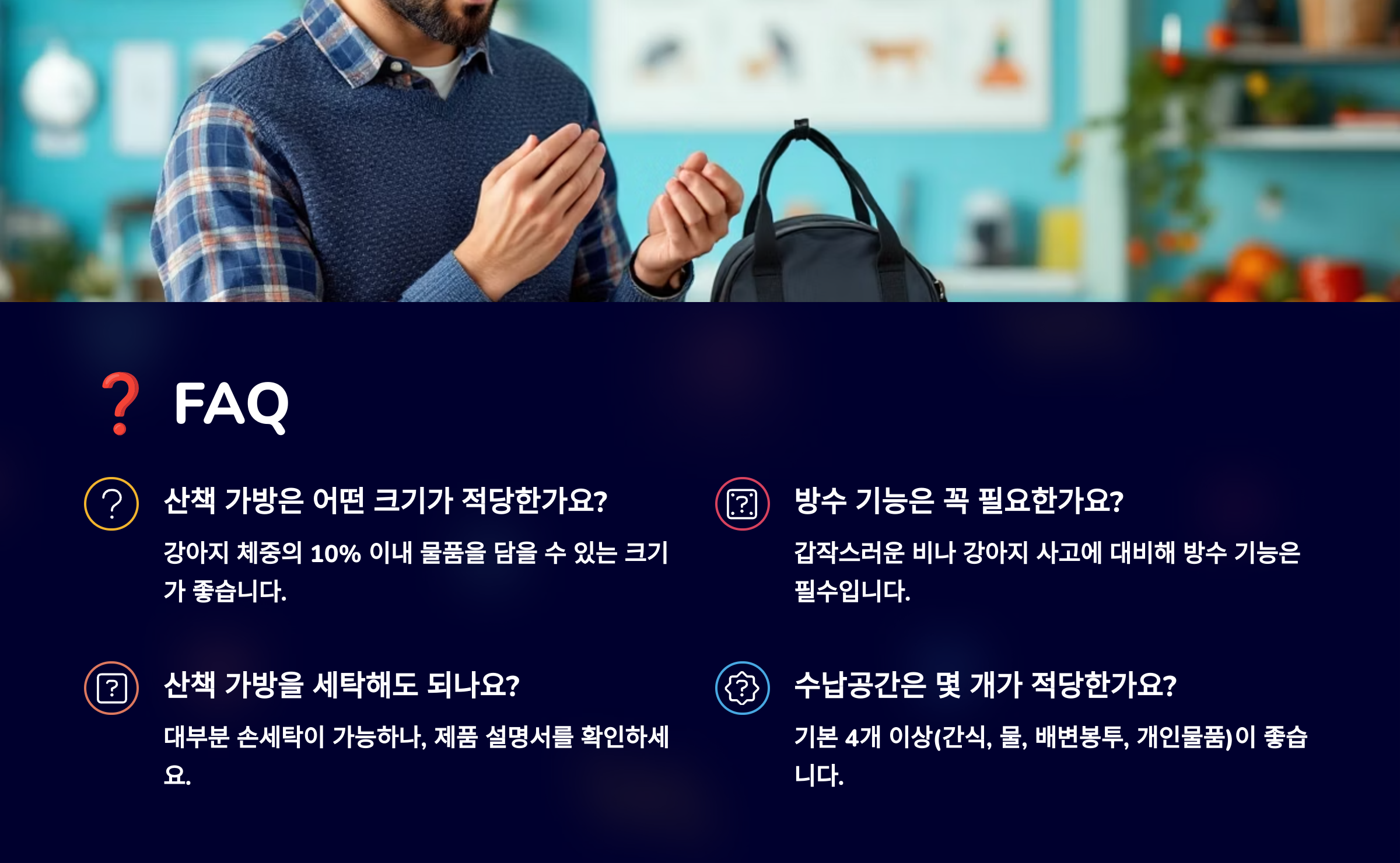 A1. 강아지의 크기와 자신의 산책 패턴에 맞는 수납 용량과 편의성이 가장 중요해요. 또한 내구성과 안전성을 고려해서 KC 인증을 받은 제품을 선택하는 것이 좋아요.