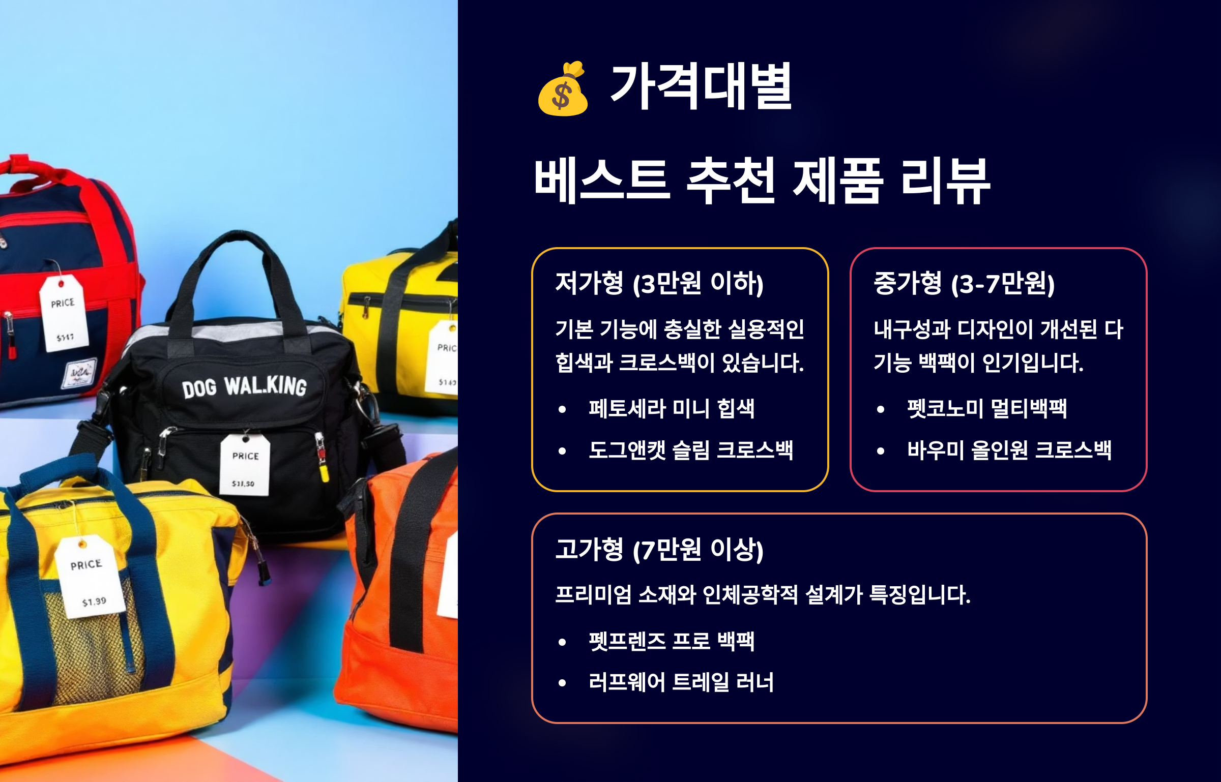 저가형(3만원 이하) 제품 중에서는 Basic Pet Walking Bag이 가성비가 뛰어나요. 2만 5천원 정도의 가격에 기본적인 수납 기능과 내구성을 모두 갖추고 있어서 초보 반려인들에게 추천해요. 5개의 포켓과 3리터 용량으로 일반적인 산책에 필요한 모든 물품을 수납할 수 있어요. 폴리에스터 소재로 가볍고 세탁이 쉬우며, 기본적인 방수 기능도 있어요. 다만 고급 기능이나 특수 소재는 없지만 실용성 면에서는 충분해요. 특히 처음 산책 가방을 구매하는 분들이 부담 없이 시작할 수 있는 제품이에요.