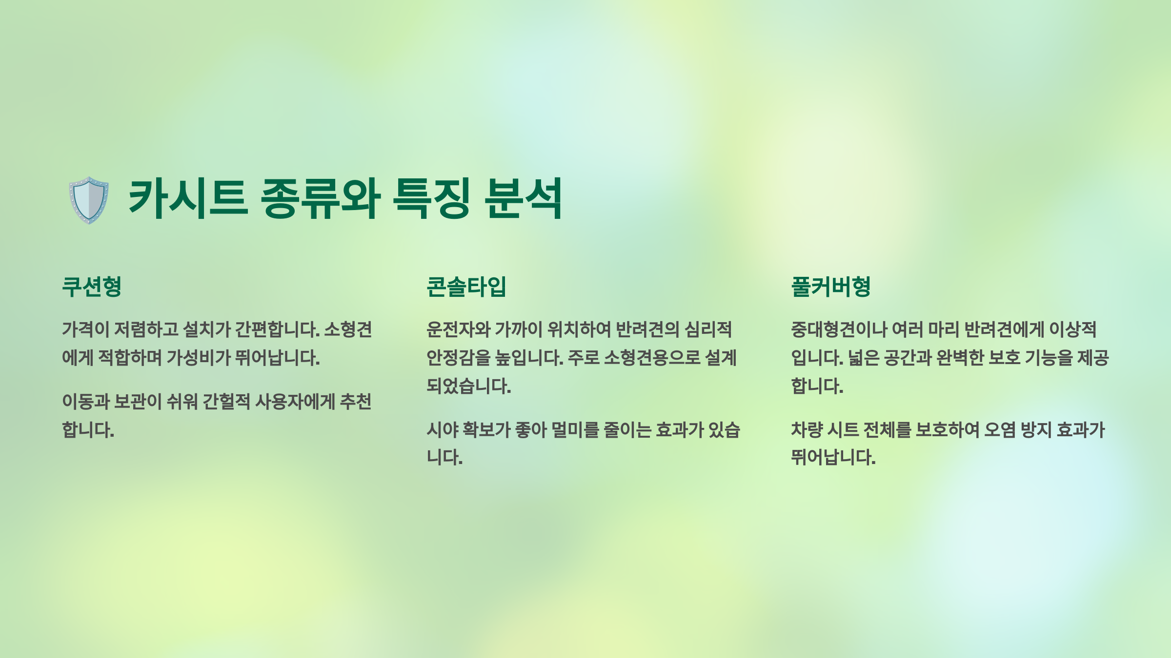 | 부스터 시트 | 소형견~중형견 | 시야 확보, 설치 간편 | 대형견 부적합 |
