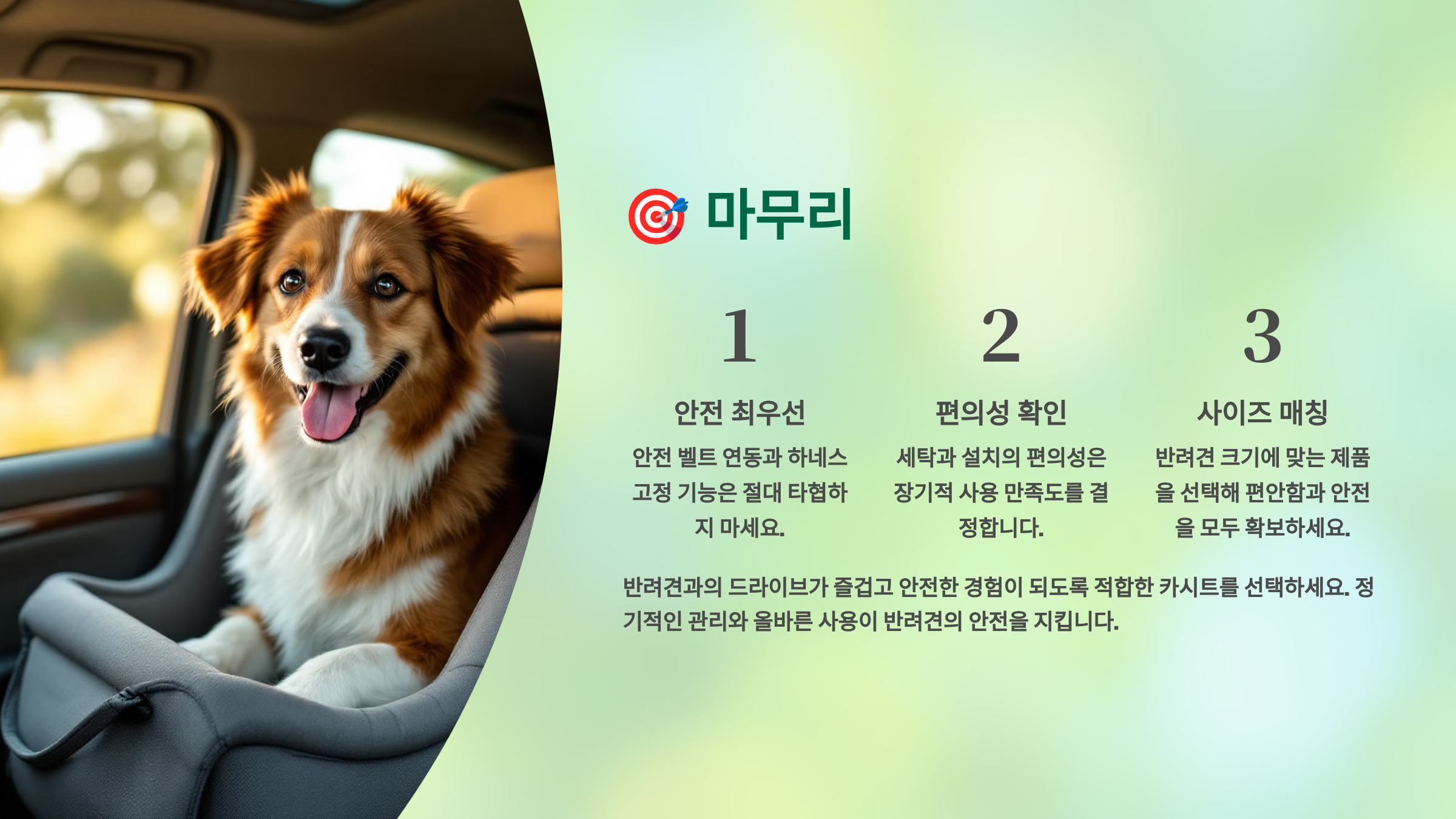 강아지 카시트는 더 이상 선택이 아닌 필수 안전장치가 되어가고 있어요. 우리 소중한 반려견의 안전을 지키는 것은 물론, 운전자와 동승자의 안전까지 보장하는 중요한 역할을 하거든요. 처음에는 비용이 부담스러울 수 있지만, 생명과 직결된 문제이니만큼 품질 좋은 제품을 선택하는 것이 현명한 투자라고 생각해요. 특히 안전성과 세탁 편의성을 모두 고려한다면 장기간 만족스럽게 사용할 수 있을 거예요.