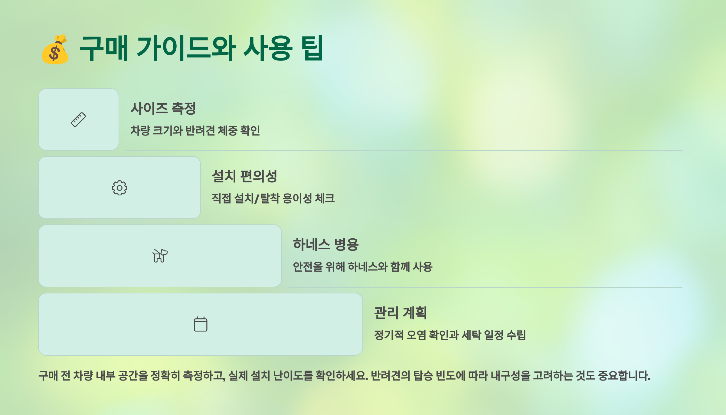 각 타입마다 장단점이 명확하기 때문에 우리 강아지의 크기와 성격, 그리고 주로 이용하는 이동 패턴을 고려해서 선택하는 것이 중요해요. 여러 타입을 준비해두고 상황에 따라 바꿔가며 사용하는 것도 좋은 방법이랍니다. 🚗