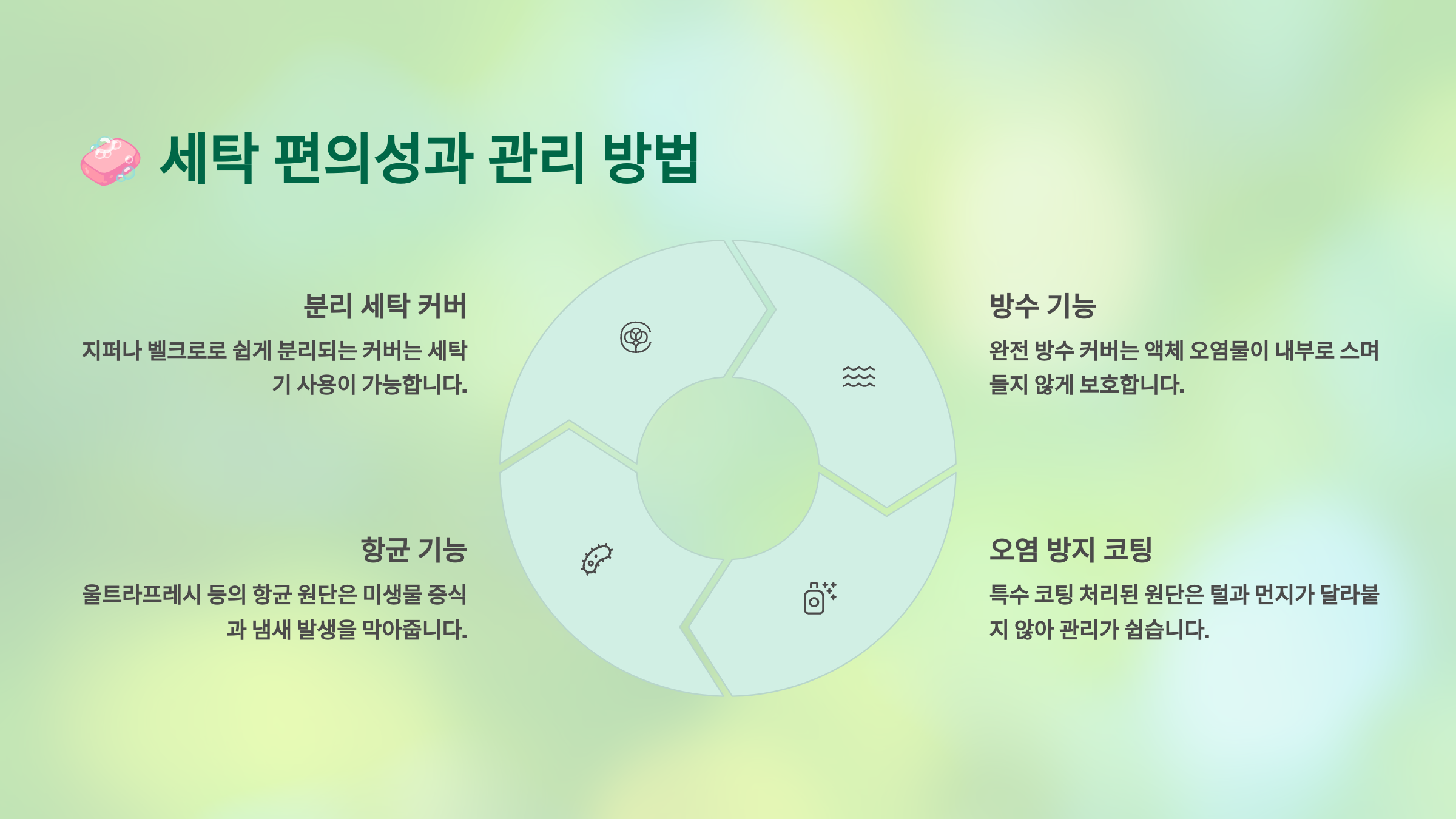 소재별로 세탁 방법이 다르다는 점도 알아두어야 해요. 폴리에스터나 나일론 소재는 일반적으로 세탁기 사용이 가능하지만, 가죽이나 일부 특수 소재는 물세탁이 불가능할 수 있어요. 구매 전에 세탁 라벨을 꼼꼼히 확인하고, 관리가 복잡한 소재라면 정말 그만한 가치가 있는지 신중히 고려해보세요. 메모리폼이나 특수 쿠션이 들어간 제품들은 형태가 변형될 수 있어서 손세탁만 가능한 경우가 많아요. 이런 제품들은 세탁 후 완전히 건조시키는 데 시간이 오래 걸리니까 여분의 커버를 준비해두는 것이 좋아요.