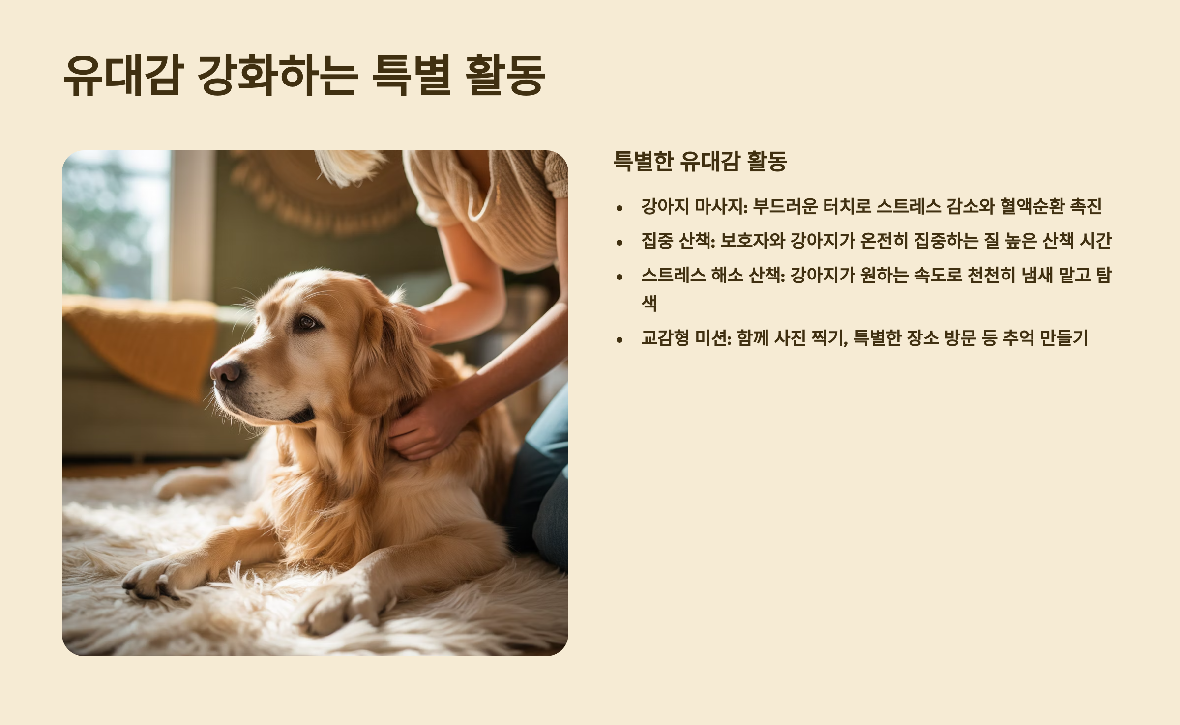 '마사지 시간'은 강아지와의 신체적 유대감을 높이는 최고의 방법이에요. 부드럽게 쓰다듬고 마사지해주는 시간은 강아지의 스트레스를 줄여주고 혈액순환도 도와줘요. 특히 잠들기 전 마사지는 강아지를 편안하게 해주고, 보호자와의 신뢰를 더욱 깊게 만들어요. 발가락 사이, 귀 뒤, 목 부분을 부드럽게 마사지해주면 강아지가 특히 좋아해요.