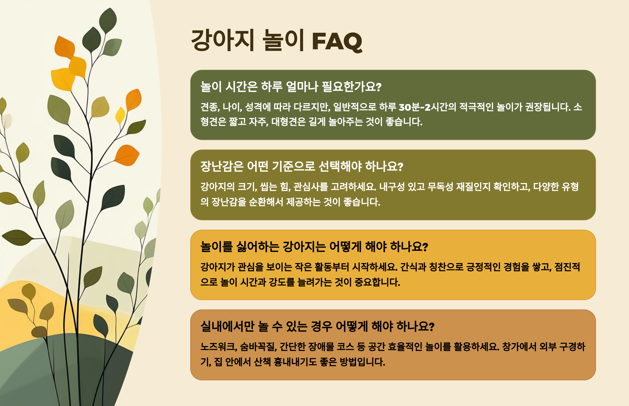 놀이를 통해 만들어가는 추억들은 평생 잊지 못할 보물이 될 거예요. 매일매일이 특별한 순간이 되도록, 오늘부터라도 강아지와 함께 즐거운 놀이 시간을 가져보는 건 어떨까요? 여러분과 강아지의 행복한 동행을 응원합니다! 🐾💕