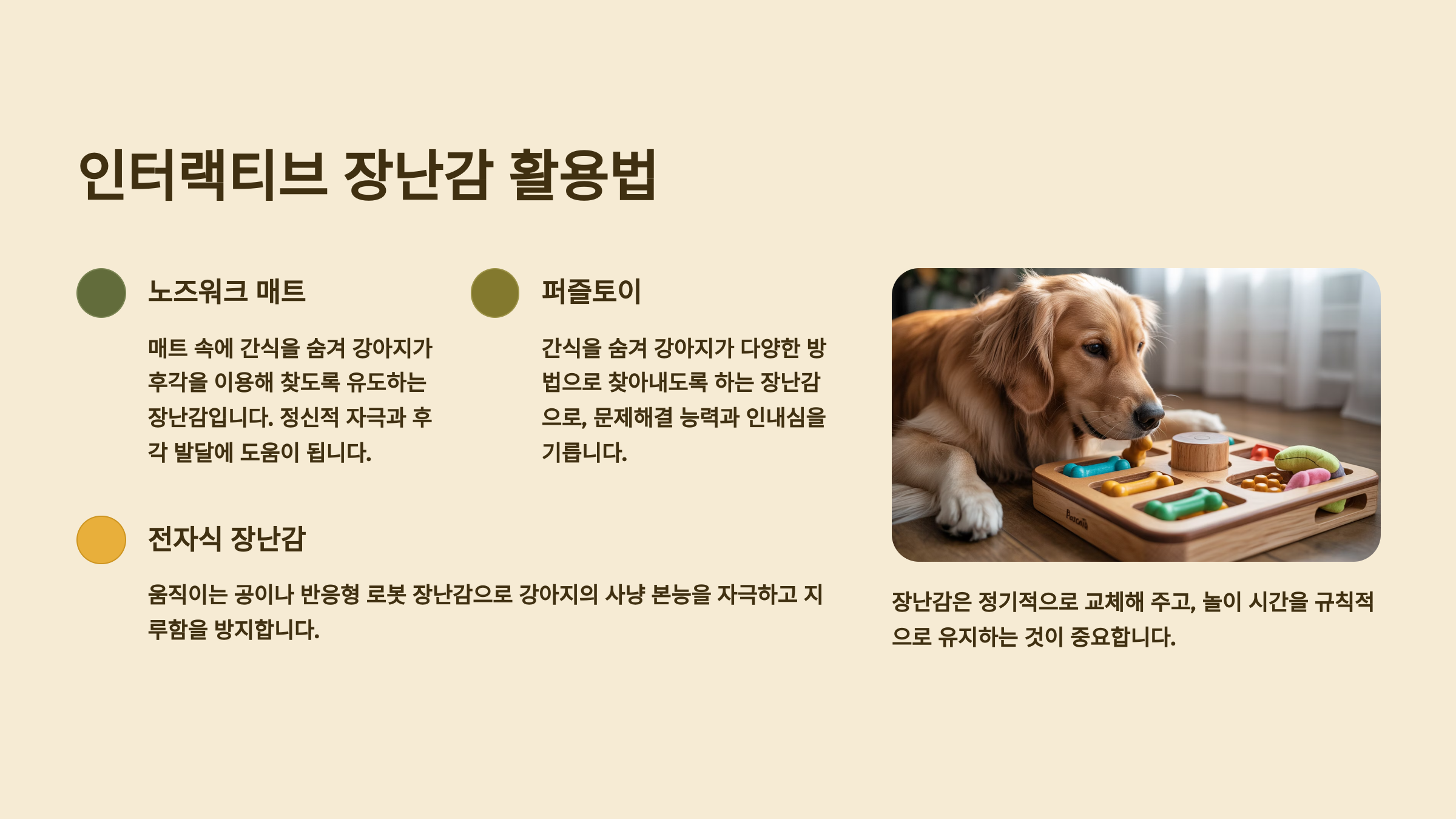 인터랙티브 장난감의 가장 큰 장점은 강아지의 독립성을 키워준다는 거예요. 혼자서도 즐겁게 시간을 보낼 수 있게 되면 분리불안이 줄어들고, 보호자가 없을 때도 안정적으로 지낼 수 있어요. 하지만 이런 장난감이 보호자와의 놀이 시간을 완전히 대체할 수는 없다는 점을 기억해야 해요.