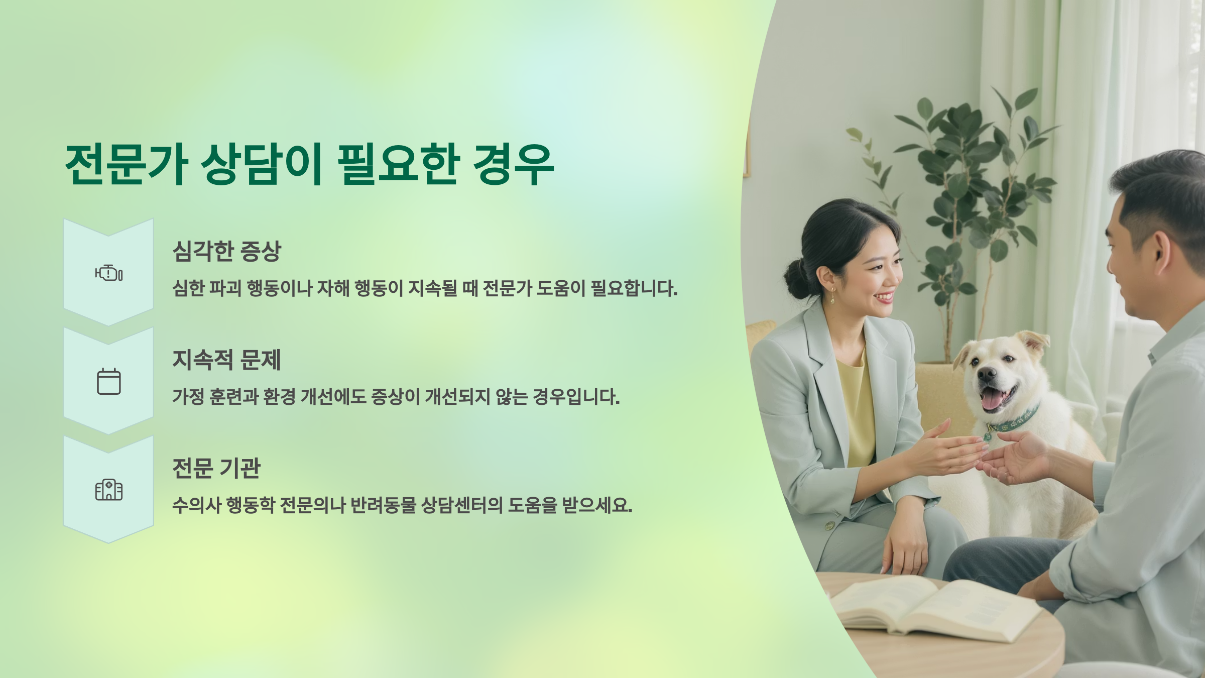 전문가 상담의 가장 큰 장점은 객관적인 평가와 체계적인 접근이에요. 보호자는 감정적으로 연결되어 있어 문제를 객관적으로 보기 어려울 수 있어요. 전문가는 냉정하게 상황을 분석하고 가장 효과적인 해결책을 제시할 수 있죠. 투자한 시간과 비용 이상의 가치를 얻을 수 있을 거예요! 👩‍⚕️