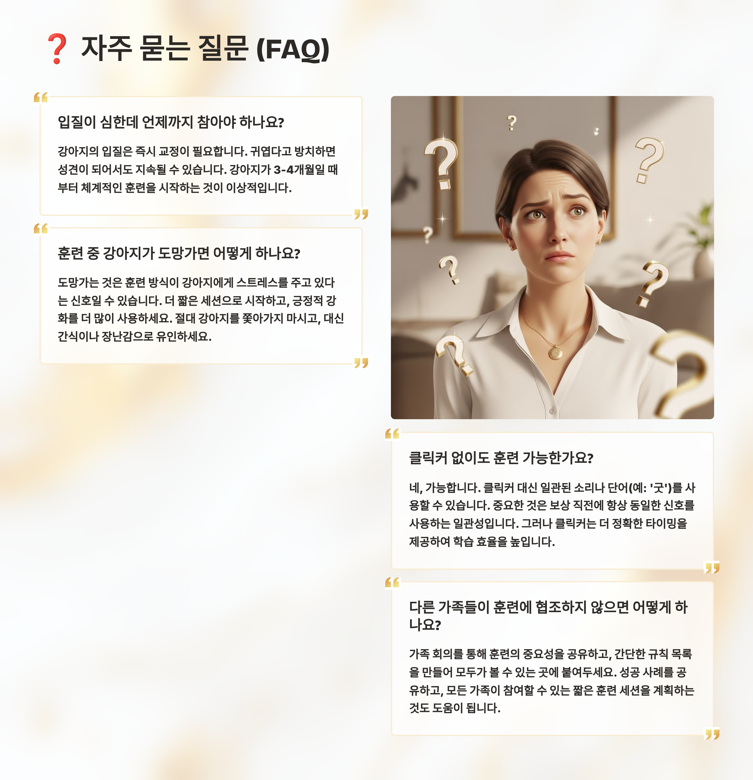 A29. 잠깐만요! 대부분의 입질은 교정 가능해요. 전문 훈련사 상담을 꼭 받아보세요. 많은 보호자가 같은 고민을 하지만 훈련으로 해결했어요. 포기하지 마세요!