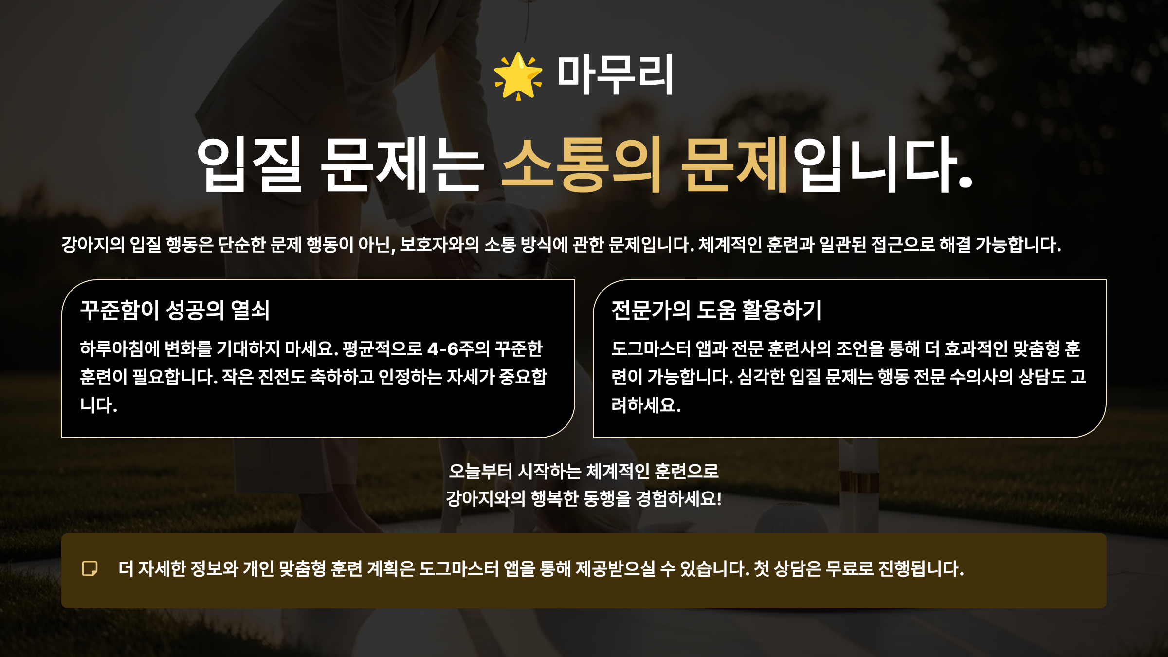 입질이 너무 심하거나 개선이 더딘 경우에는 주저하지 말고 전문 훈련사의 도움을 받으세요. 특히 공격적인 입질이나 성견의 갑작스러운 입질은 전문가 상담이 필수예요. 온라인 상담도 가능하니 부담 갖지 마세요. 저도 처음엔 혼자 해결하려고 했다가 전문가 도움받고 나서 훨씬 빨리 개선됐어요!