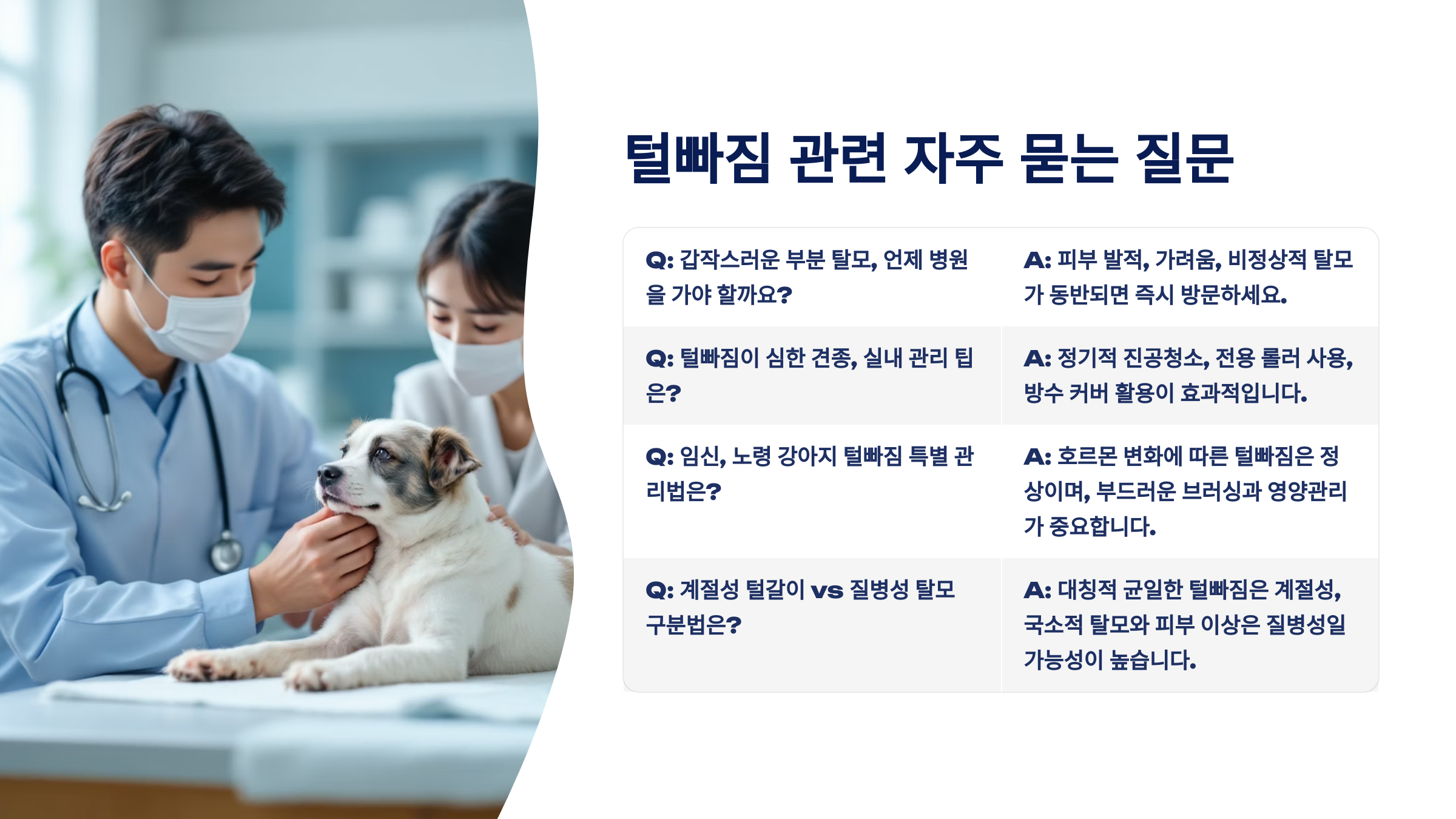 A8. 실내 온도가 일정하면 자연스러운 털갈이 주기가 깨질 수 있어요. 스트레스, 영양 문제, 질병 등의 가능성도 있으니 수의사 상담을 받아보세요.