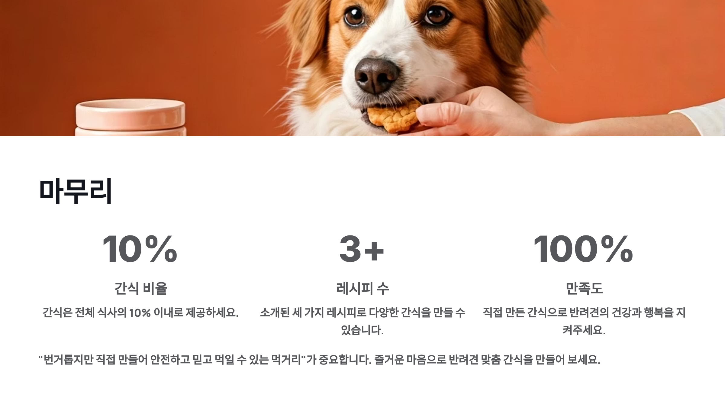 오늘 배운 내용을 바탕으로 이제 우리 집에서도 ‘반려견 간식 셰프’가 되어보세요.