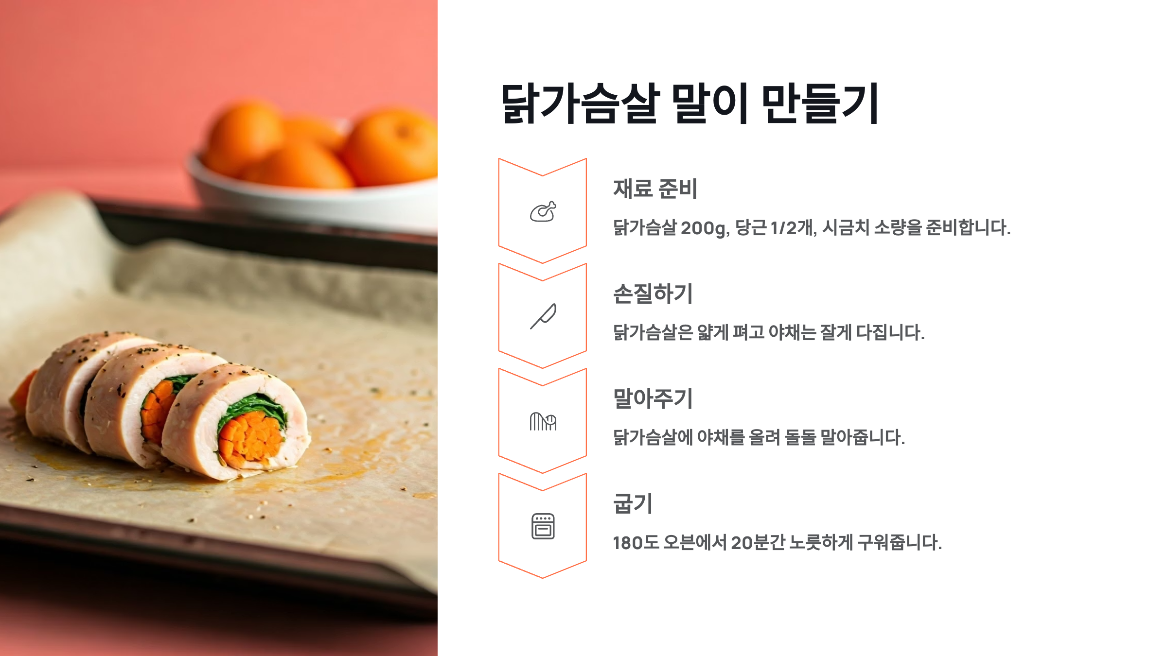 고구마를 미리 살짝 찌거나 전자레인지에 2~3분 정도 돌려주면 말기가 더 쉬워요. 너무 익히면 부서지니 살짝만 부드럽게 해주세요. 그다음 닭가슴살로 돌돌 말아주면 준비 완료예요! 👨🍳