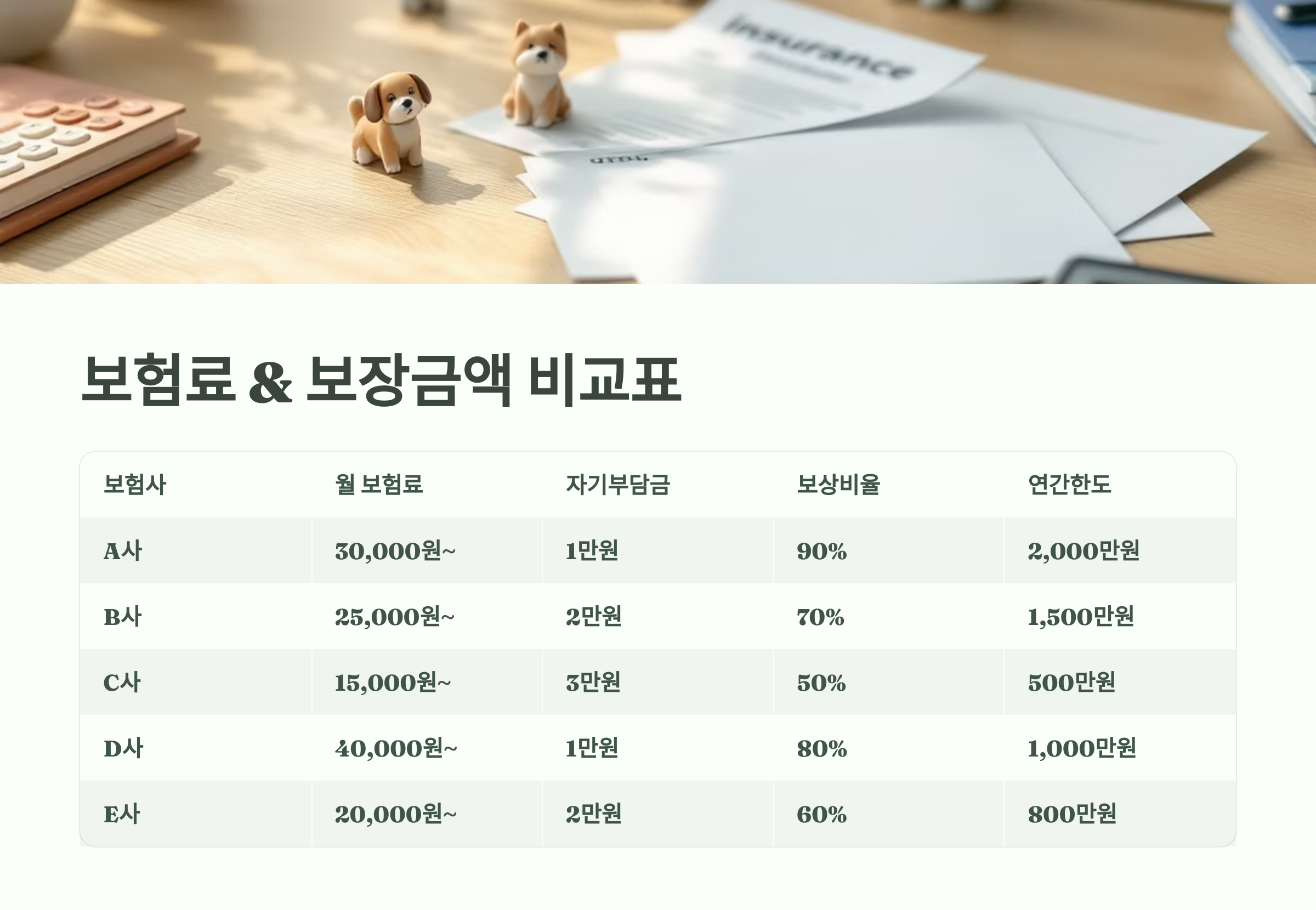 아래는 대표 보험사 5곳의 월 보험료와 보장금액을 기본 플랜 기준으로 비교한 표예요. 다견 가입 시 할인 전·후 보험료 차이도 함께 정리했으니 참고해보세요! 🐶💰