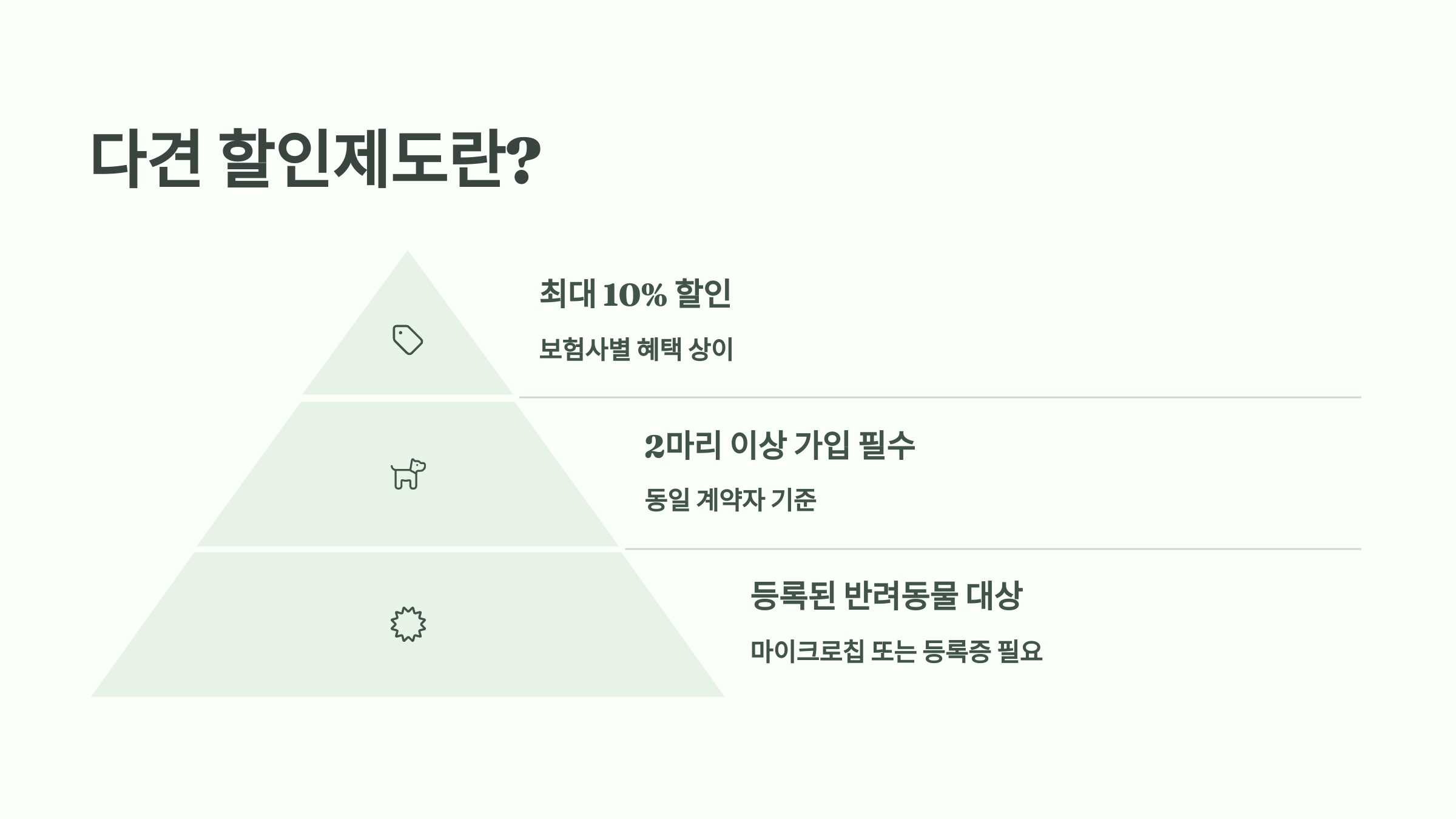 보통 다견 할인은 두 마리 이상 가입 시 각 보험료의 5~10% 할인이 적용돼요. 강아지 수가 늘어날수록 할인률이 높아지기도 하고, 어떤 보험사는 세 마리 이상부터만 할인을 제공하기도 해요. 📉