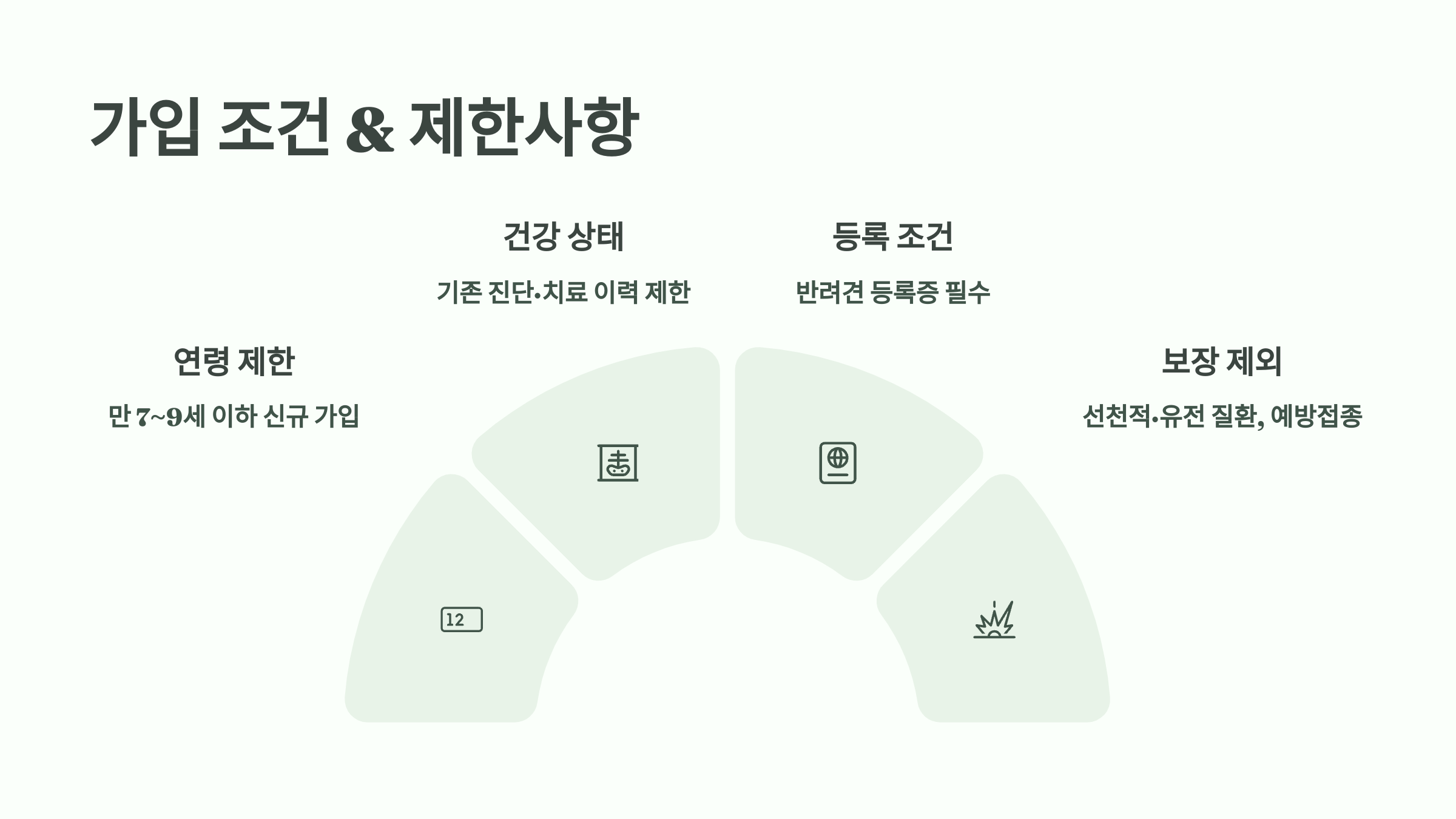 가장 기본적인 조건은 '연령'이에요. 보험사마다 조금씩 다르지만, 대부분 생후 2개월 ~ 만 8세까지 신규 가입이 가능해요. 9세 이후부터는 거의 가입이 불가능하거나, 특약 제외 조건이 붙어요. ⏳