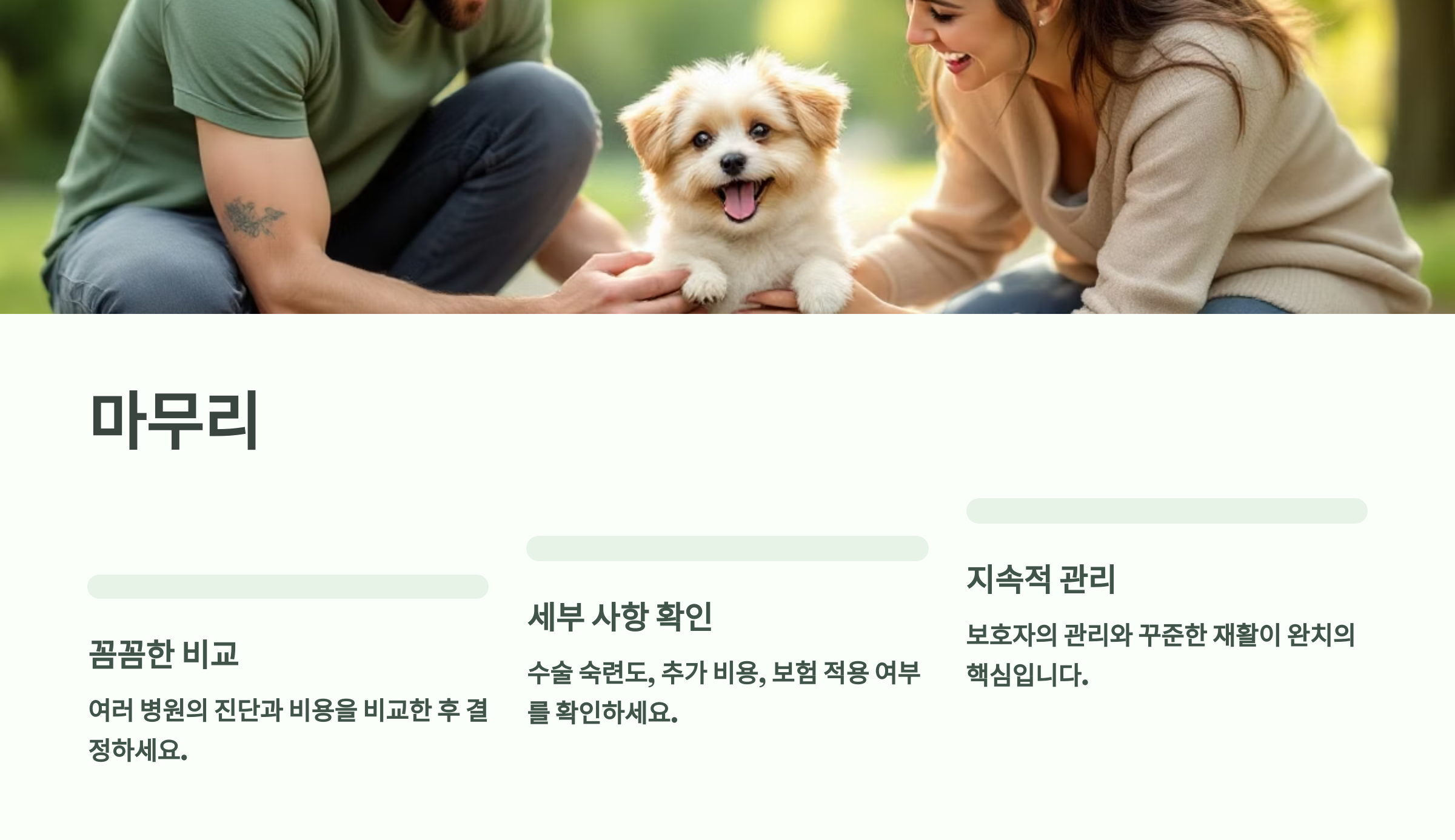 비용도 중요하지만, 병원 선택, 수술 경험, 수의사의 설명, 그리고 무엇보다 회복 후 케어가 훨씬 더 중요한 포인트랍니다.