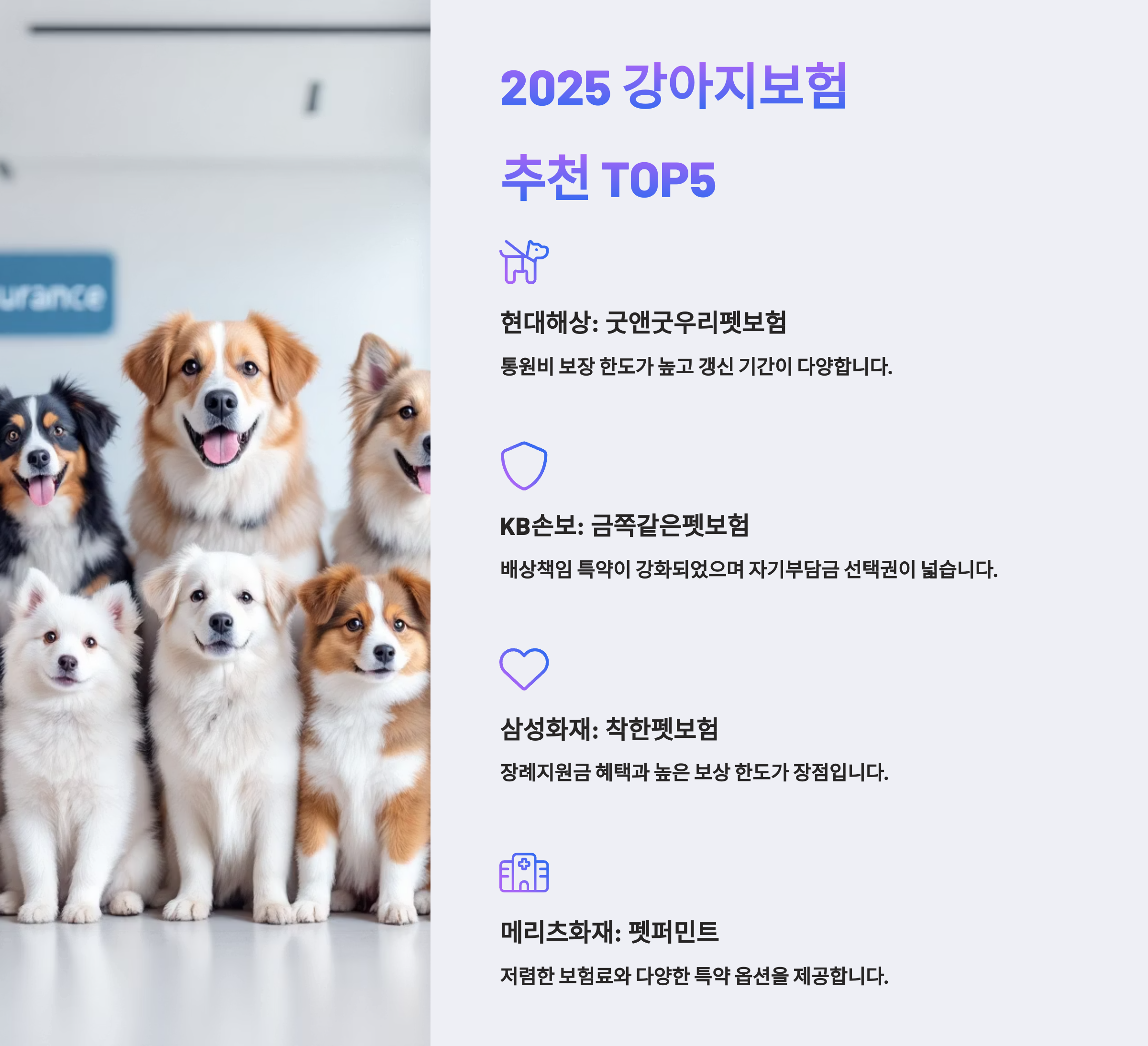 아래는 가장 많이 찾는 인기 강아지보험 TOP5를 보장, 가격, 가입 조건 중심으로 비교해 본 표예요. 🐶📊