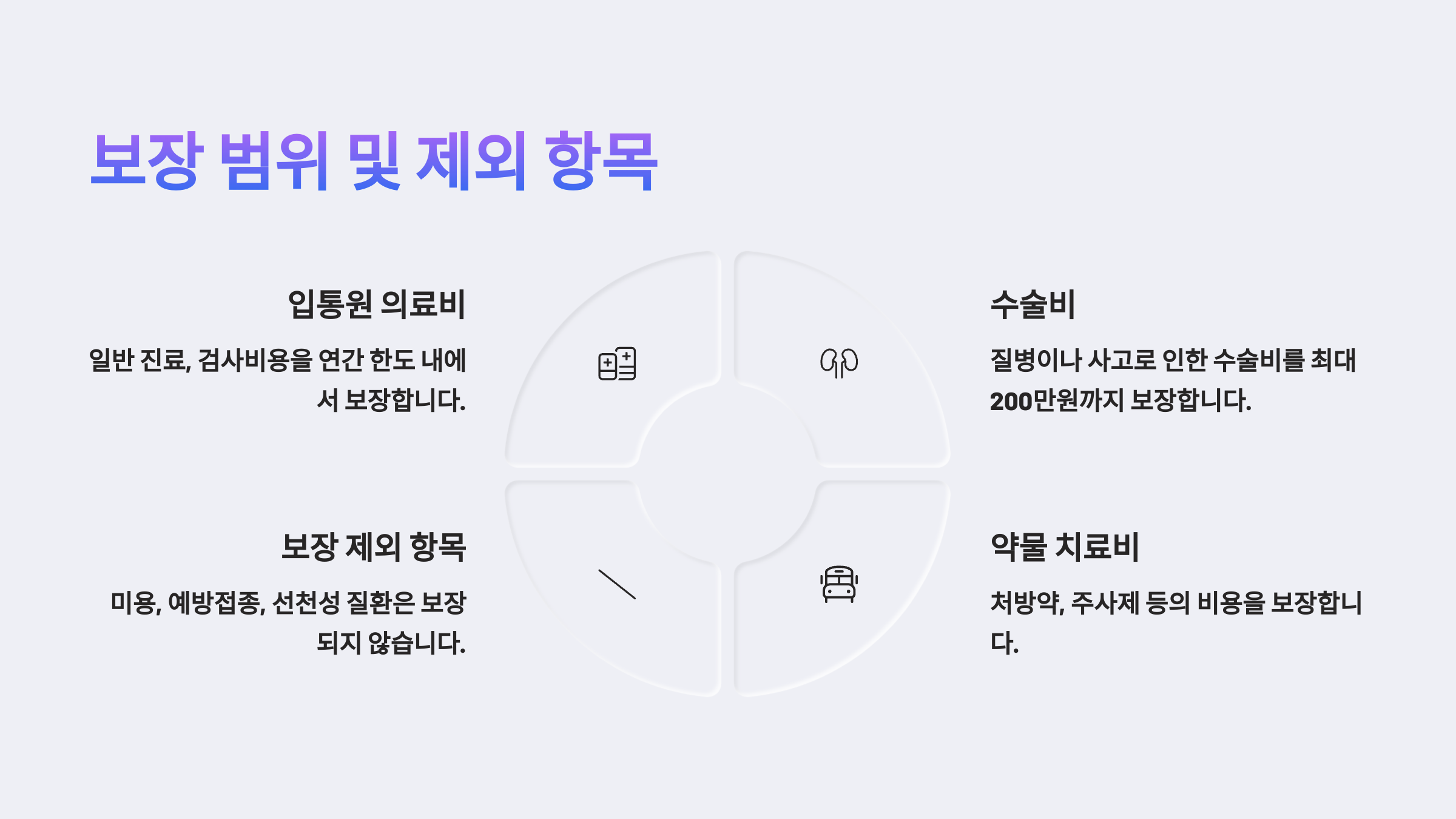 📌 정리하자면, 갑작스런 사고, 급성 질환, 반복 치료가 필요한 병원비는 보장되지만, 예방 목적이거나 미용성 목적이면 제외된다는 점 기억해요!