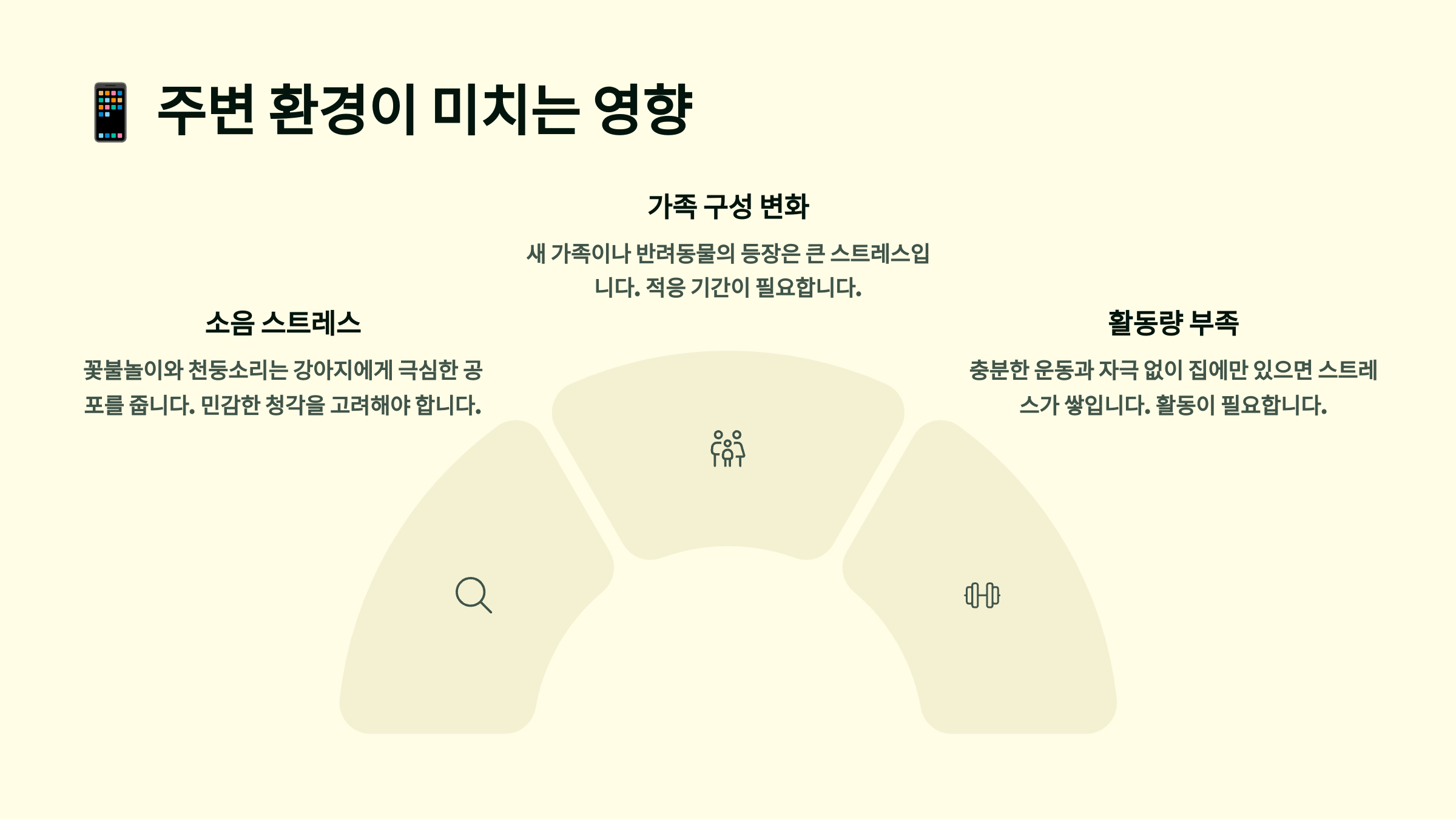 다음은 강아지가 받는 스트레스에 큰 영향을 주는 ‘환경적 요인’에 대해 알려드릴게요! 주변 환경이 바뀌는 것만으로도 강아지는 크게 흔들릴 수 있어요. 🏠📱