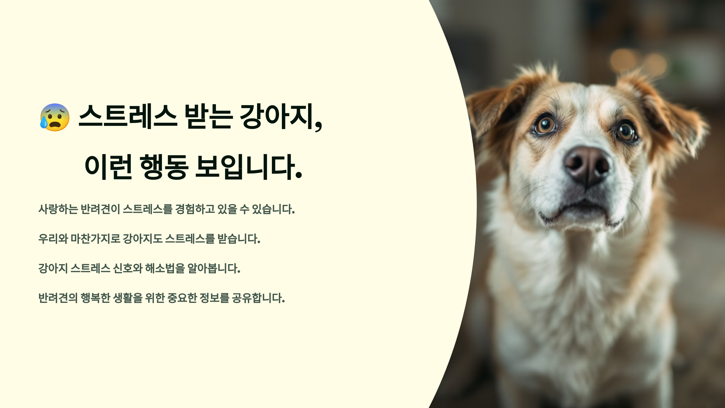 🐶 강아지가 꼬리를 흔들고 잘 놀기만 한다고요? 사실 그 속엔 말 못 할 스트레스가 쌓여 있을지도 몰라요. 강아지의 스트레스는 다양한 행동 변화로 표현되기 때문에 제때 알아차리지 못하면 불안이나 분리불안으로까지 이어질 수 있어요. 😢