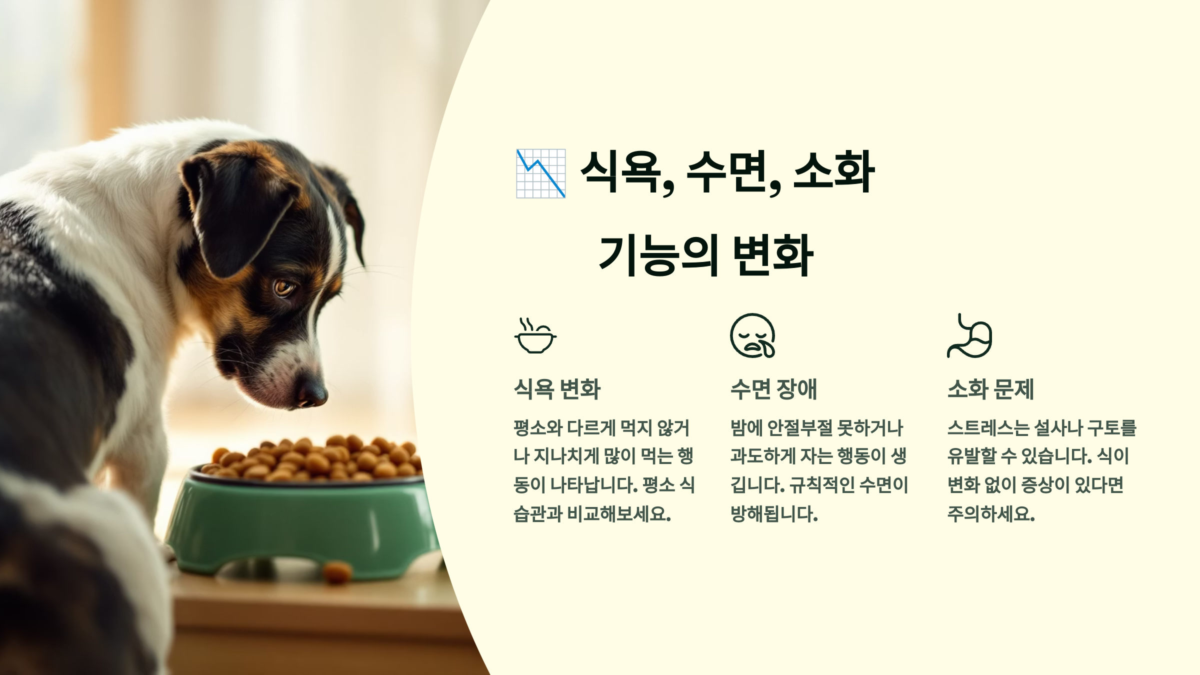 🍽️ 스트레스는 강아지의 신체 시스템 전반에 영향을 줘요. 특히 식욕, 수면, 배변은 가장 민감하게 반응하는 영역이에요. 강아지가 평소와 다른 습관을 보인다면, 단순 컨디션 저하가 아닌 심리적 불안 상태일 가능성을 고려해봐야 해요. 🧐