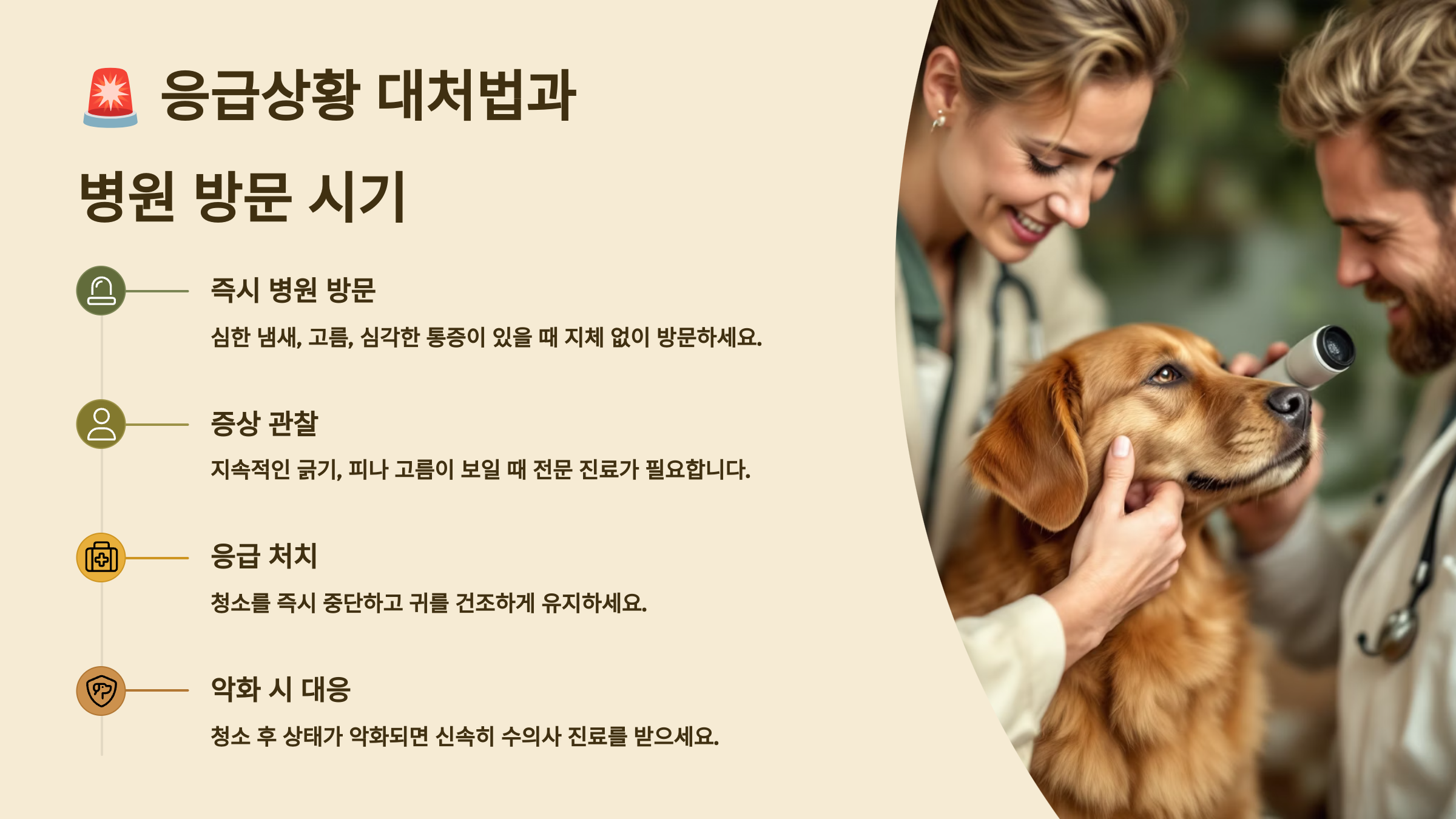 알레르기 반응도 주의해야 할 응급상황 중 하나예요. 새로운 귀청소 제품을 사용한 후에 강아지가 과도하게 귀를 긁거나, 귀 주변이 빨갛게 부어오르거나, 두드러기가 생긴다면 알레르기 반응일 수 있어요. 이런 경우에는 즉시 찬물로 귀 주변을 씻어내고, 얼음찜질을 해서 염증을 가라앉혀주세요. 하지만 호흡곤란이나 전신 두드러기 같은 심한 알레르기 반응이 나타나면 생명을 위협할 수 있으니까 즉시 응급실로 가야 해요.