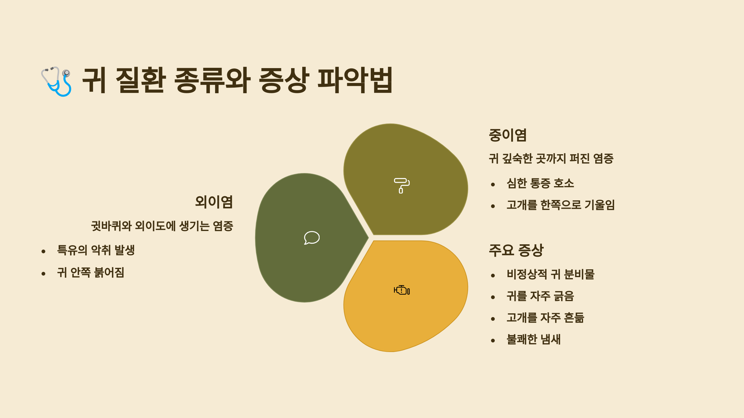 | 진균성 외이도염 | 가려움, 곰팡이냄새 | 검은색/갈색 끈적함 | 중간 |