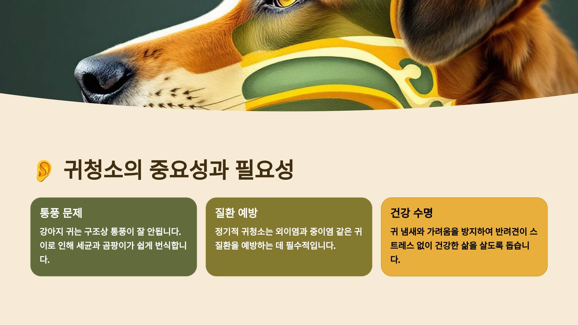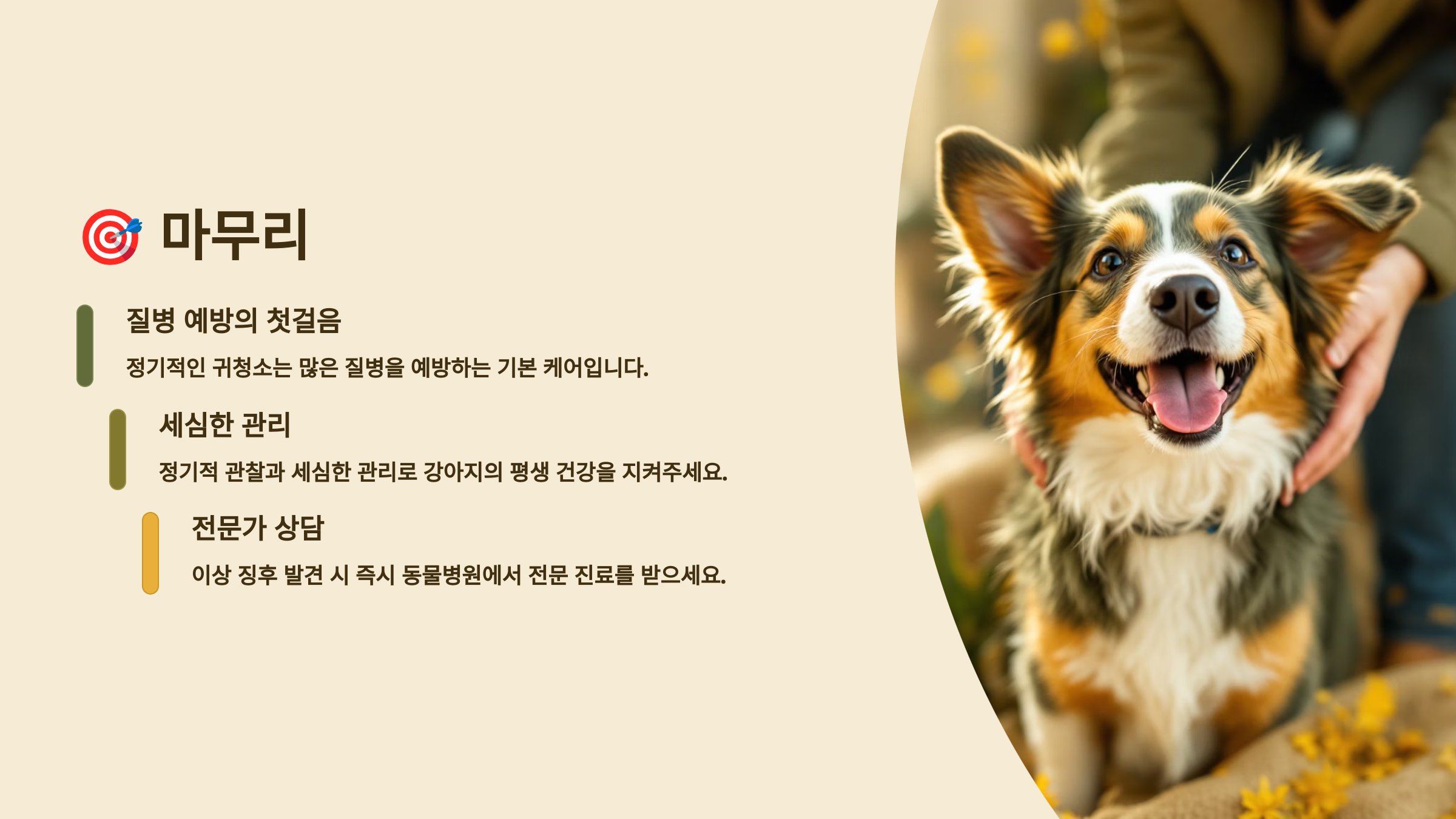 정기적인 귀청소와 일상 관리를 통해 우리 반려견이 귀 질환 없이 건강하게 살 수 있도록 도와주세요. 작은 관심과 노력이 큰 병을 예방할 수 있고, 강아지의 삶의 질을 크게 향상시킬 수 있어요. 언제나 강아지의 신호에 귀 기울이고, 이상이 있을 때는 주저하지 말고 전문가의 도움을 받으세요. 건강한 귀로 더욱 행복한 반려생활을 만들어가시길 바라요! 🐕💙