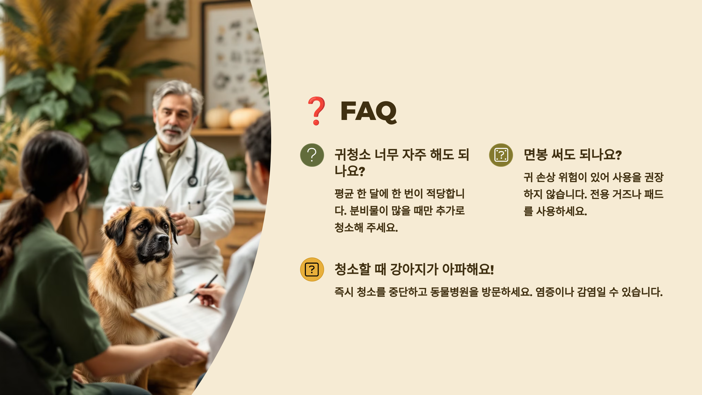 A1. 건강한 강아지는 2-4주에 한 번이면 충분해요. 하지만 코커스패니얼이나 푸들 같은 귀가 늘어진 장모종은 주 1-2회, 귀 질환이 있는 경우는 수의사 지시에 따라 더 자주 해야 할 수도 있어요. 너무 자주 하면 오히려 해롭습니다.