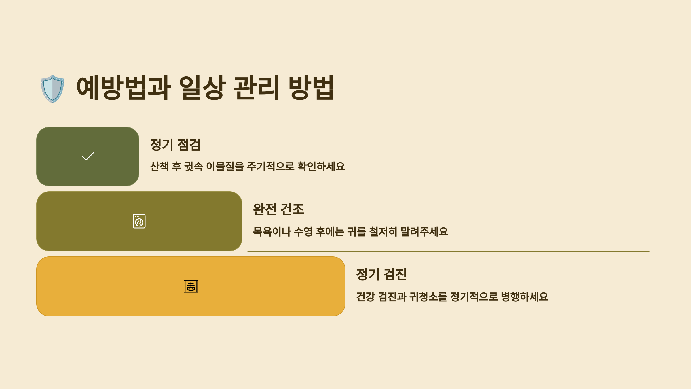 | 1단계 | 귀 상태 확인 | 1-2분 | 염증 유무 체크 |