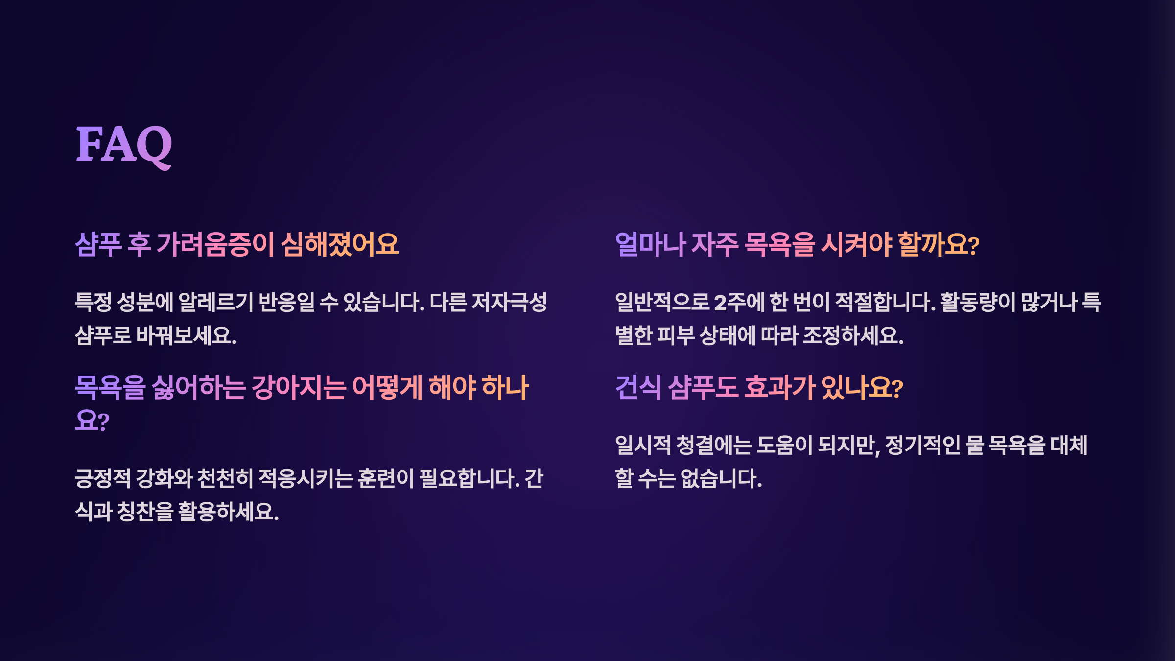 올바른 목욕법과 사후 관리도 샴푸만큼이나 중요해요. 아무리 좋은 샴푸를 사용해도 잘못된 방법으로 목욕을 시키면 오히려 피부에 해가 될 수 있어요. 특히 민감성 피부를 가진 강아지들은 더욱 세심한 관리가 필요하다는 점을 기억해주세요.