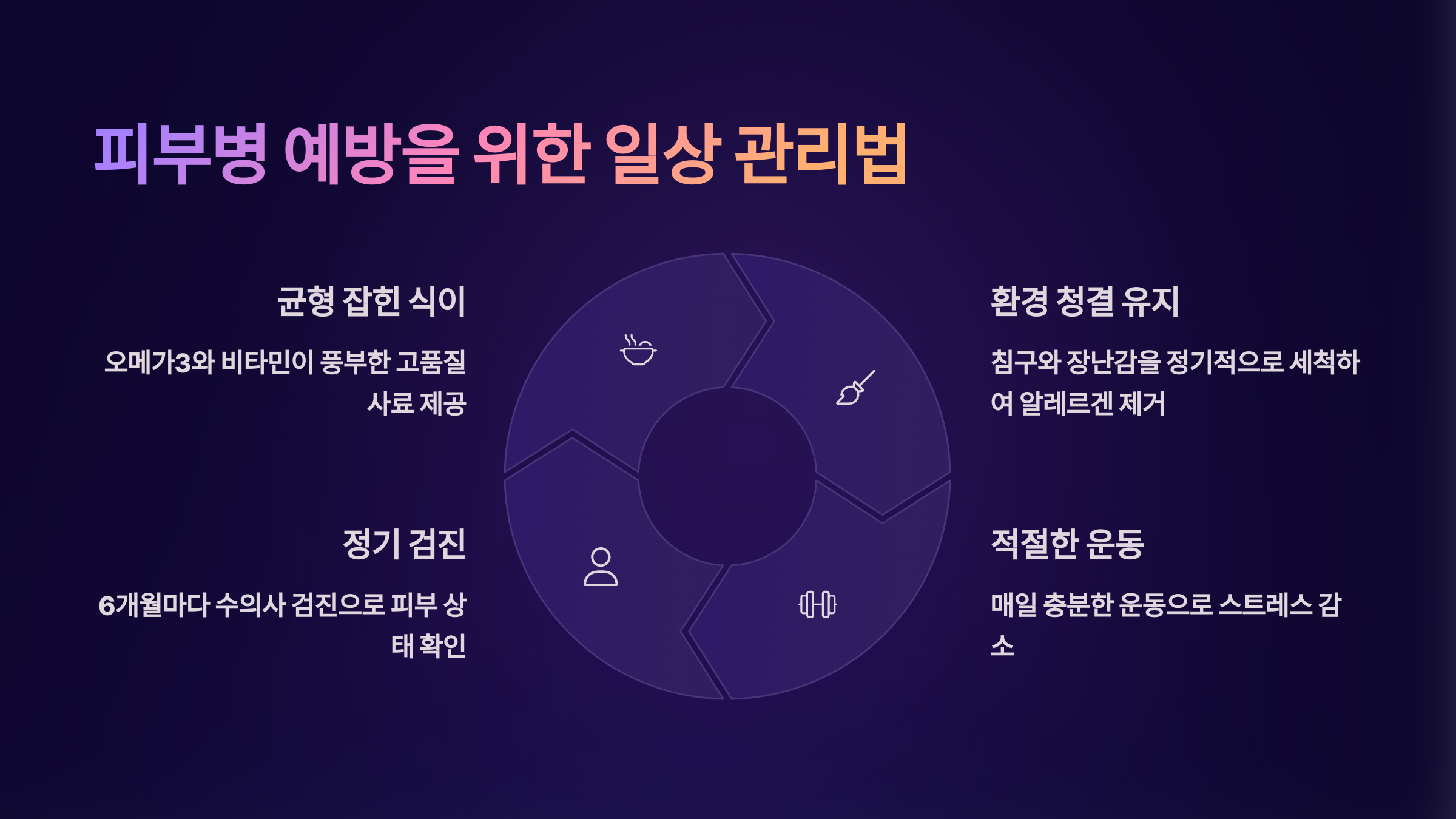피부병 예방의 핵심은 피부 장벽 기능을 건강하게 유지하는 거예요. 건강한 피부는 외부 병원균과 알레르겐으로부터 몸을 보호하는 첫 번째 방어막 역할을 해요. 적절한 유분과 수분 밸런스, 정상적인 pH 유지, 유익한 피부 미생물 균형 등이 모두 중요한 요소들이에요. 이 모든 것들을 고려한 적절한 샴푸 선택과 올바른 사용법이 피부병 예방의 출발점이라고 할 수 있어요.