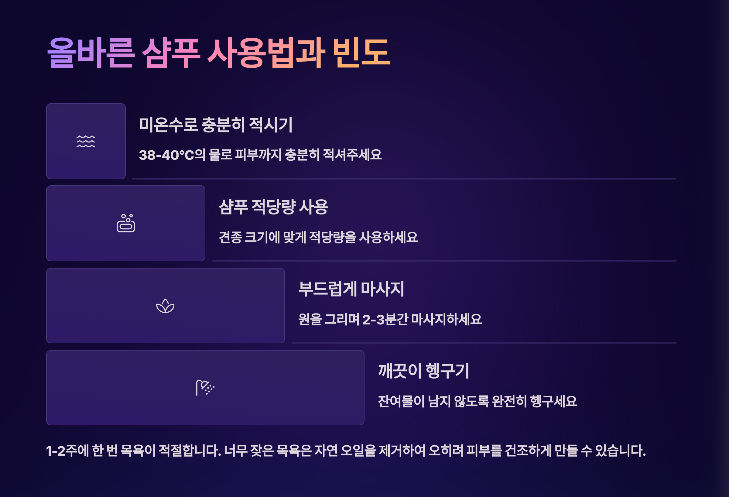 목욕은 강아지에게 스트레스가 될 수 있어서 빈도보다는 질이 더 중요해요. 한 번 할 때 제대로 해주는 것이 자주 대충 하는 것보다 훨씬 효과적이에요! 🎯