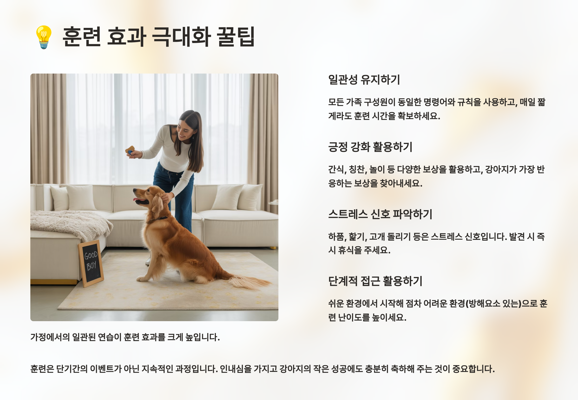 훈련을 통해 얻는 것은 단순히 '앉아', '기다려'를 하는 강아지가 아니에요. 서로를 이해하고 신뢰하는 진정한 가족이 되는 거죠. 산책이 즐거워지고, 카페나 여행도 함께 갈 수 있어요. 무엇보다 강아지가 행복해진다는 게 가장 큰 보상이에요! 🌟