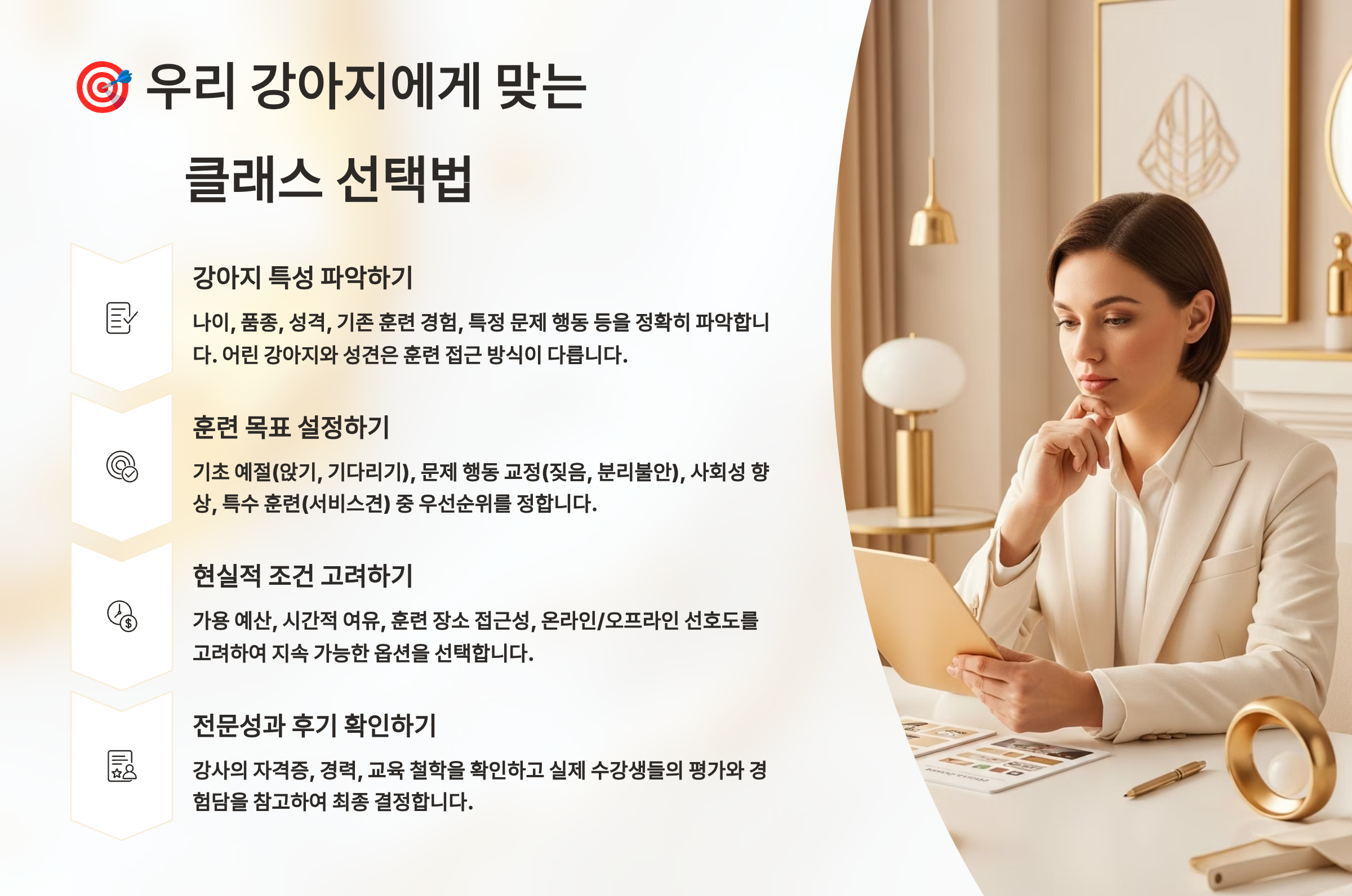 모든 강아지가 같은 훈련이 필요한 것은 아니에요. 견종, 나이, 성격, 생활 환경에 따라 최적의 훈련 방법이 달라지죠. 잘못된 선택은 시간과 돈 낭비일 뿐만 아니라 강아지에게 스트레스를 줄 수 있어요. 우리 강아지에게 딱 맞는 클래스를 찾는 방법을 알려드릴게요! 🎯