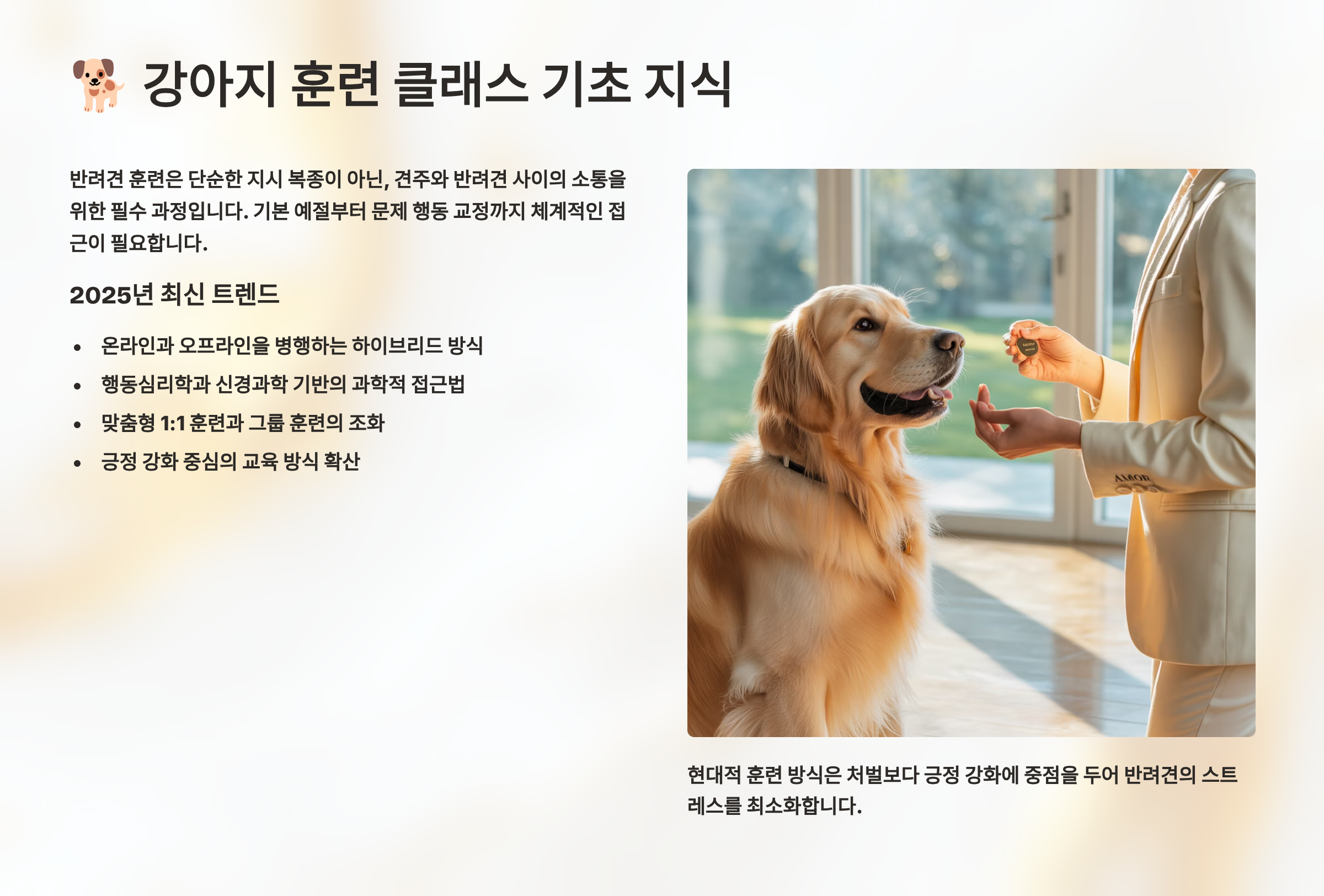 제가 생각했을 때 강아지 훈련은 반려견과 보호자 모두에게 꼭 필요한 투자예요. 문제 행동을 교정하는 것뿐만 아니라, 서로를 이해하고 신뢰를 쌓는 과정이거든요. 2025년 현재 전국에 3,000개 이상의 훈련 센터가 운영 중이며, 온라인 클래스까지 포함하면 선택지가 정말 다양해졌어요. 이제부터 각 프로그램의 특징과 비용, 실제 후기까지 상세히 알려드릴게요! 🎓