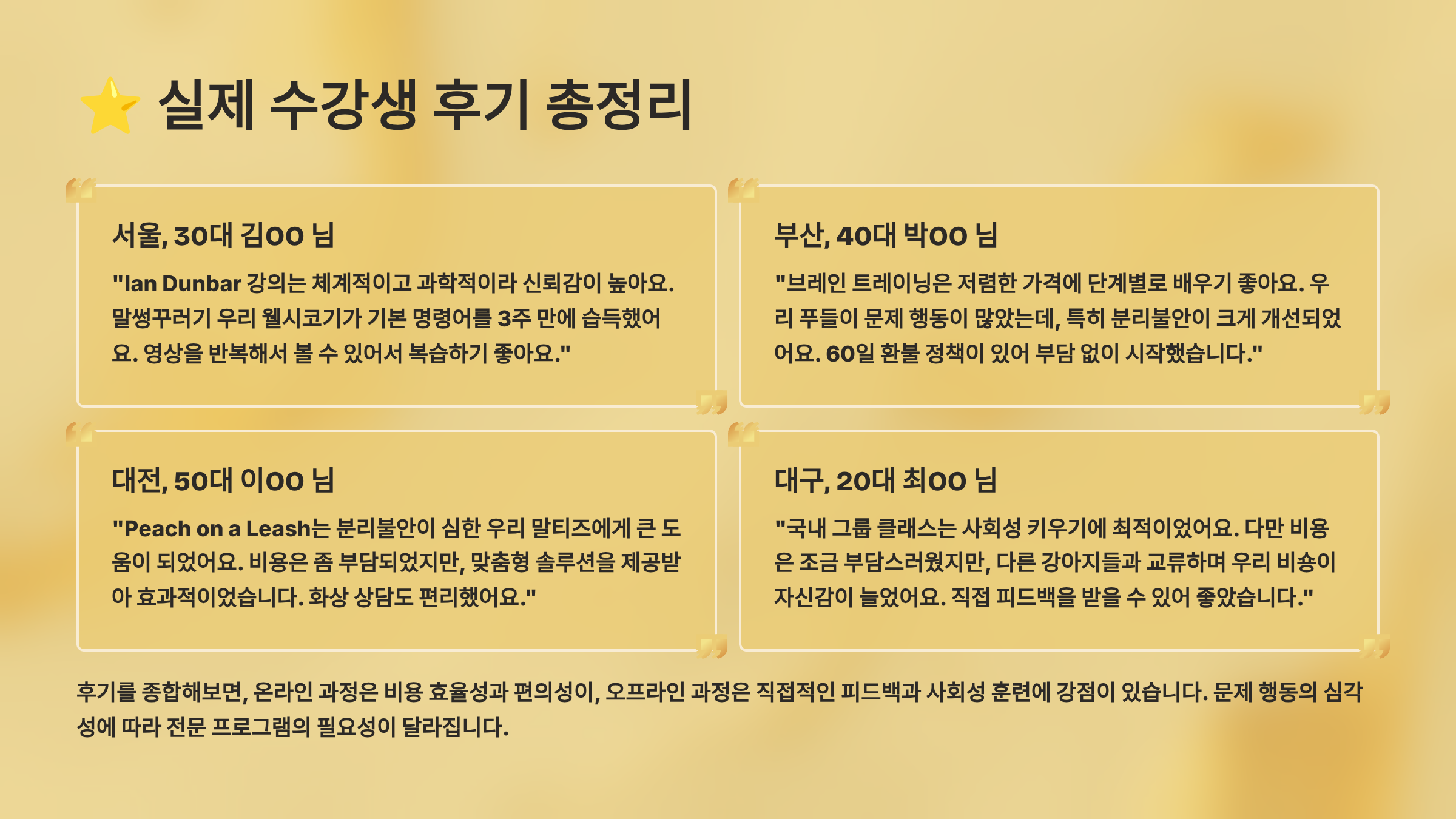 온라인 클래스 후기도 흥미로워요. "시간과 장소에 구애받지 않아서 좋았어요. 새벽에도 강의를 들을 수 있어요"라는 장점이 있는 반면, "직접적인 피드백이 부족해서 제대로 하고 있는지 불안했어요"라는 단점도 있었어요. 특히 "녹화 강의는 우리 강아지 특성을 반영하지 못해요"라는 의견이 많았어요.