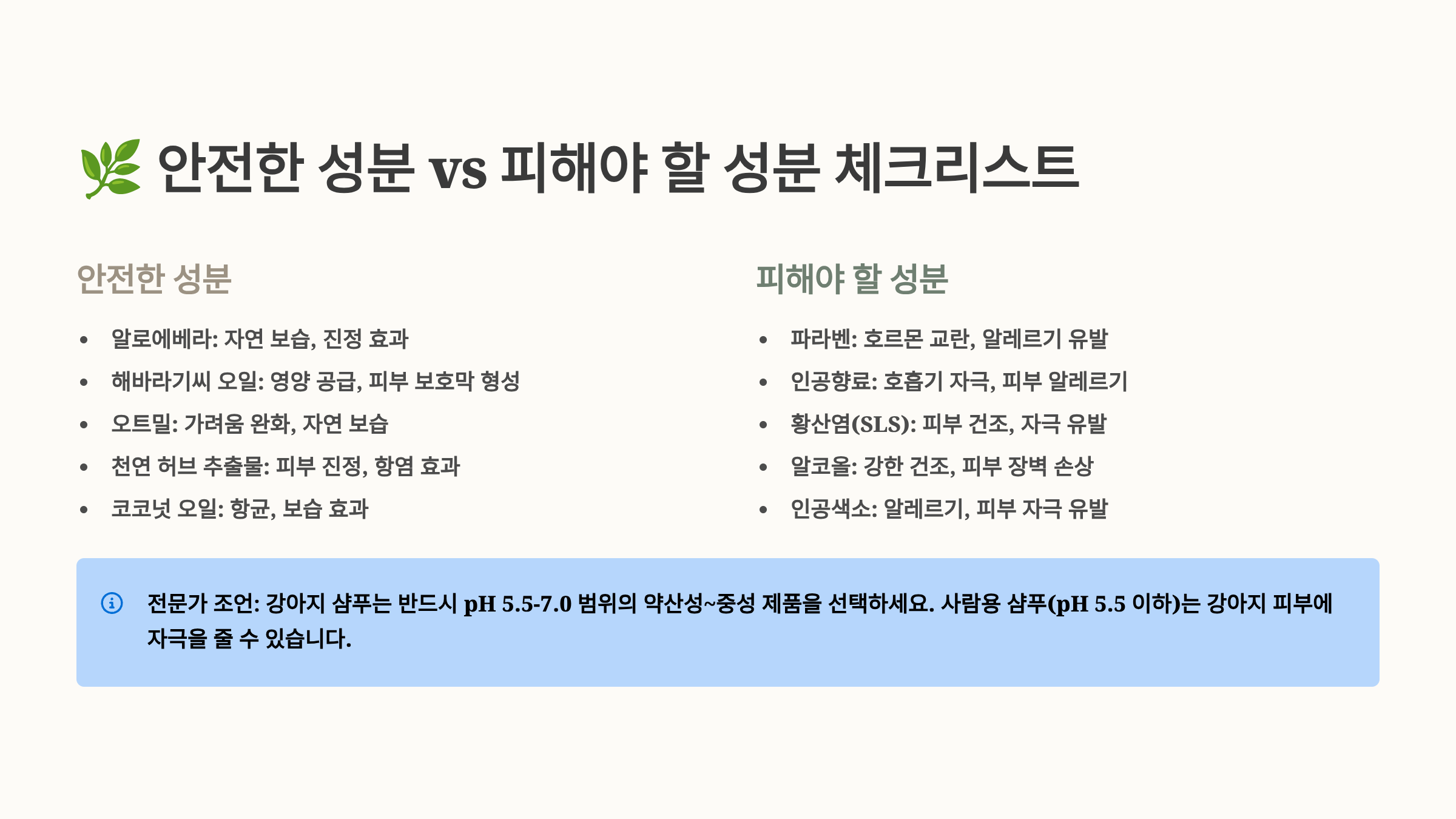 전문가들은 성분표를 꼼꼼히 확인하라고 조언해요. 수의사 김OO 원장은 "파라벤, SLS 같은 유해 성분이 없는지 확인하고, EWG 등급을 참고하는 것이 좋다"고 말했어요. 또한 "처음 사용할 때는 소량으로 패치 테스트를 꼭 해보라"고 강조했죠.