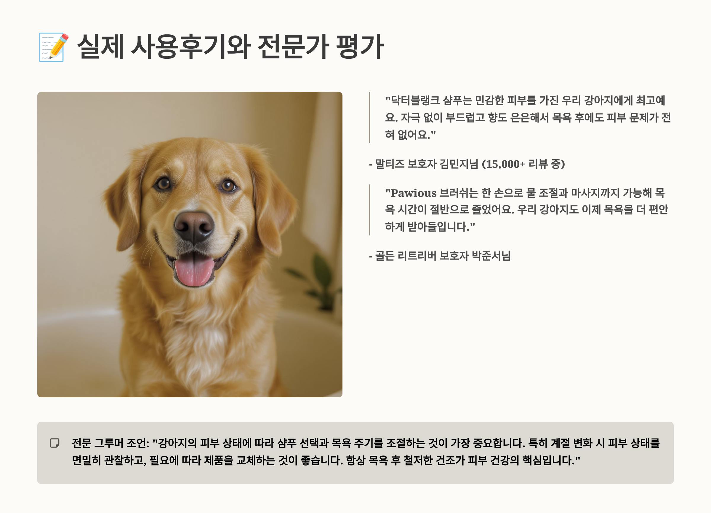 실제 사용자들의 후기와 전문가 평가를 종합해봤어요! 📊 온라인 커뮤니티, SNS, 쇼핑몰 리뷰를 분석하고, 수의사와 전문 그루머들의 의견도 들어봤죠. 제품 선택에 있어서 다른 사람들의 경험은 정말 중요한 참고자료가 돼요. 특히 비슷한 견종이나 피부 타입을 가진 강아지 보호자들의 후기는 더욱 도움이 되죠!