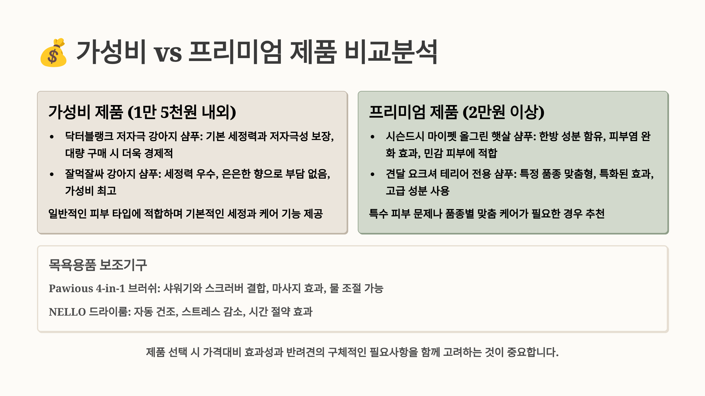 강아지 목욕용품을 고를 때 가격도 중요한 고려사항이에요! 💸 비싸다고 무조건 좋은 것도 아니고, 싸다고 나쁜 것도 아니죠. 중요한 건 우리 아이에게 맞는 제품을 합리적인 가격에 구매하는 거예요. 가성비 제품과 프리미엄 제품의 차이점을 자세히 알아볼게요!